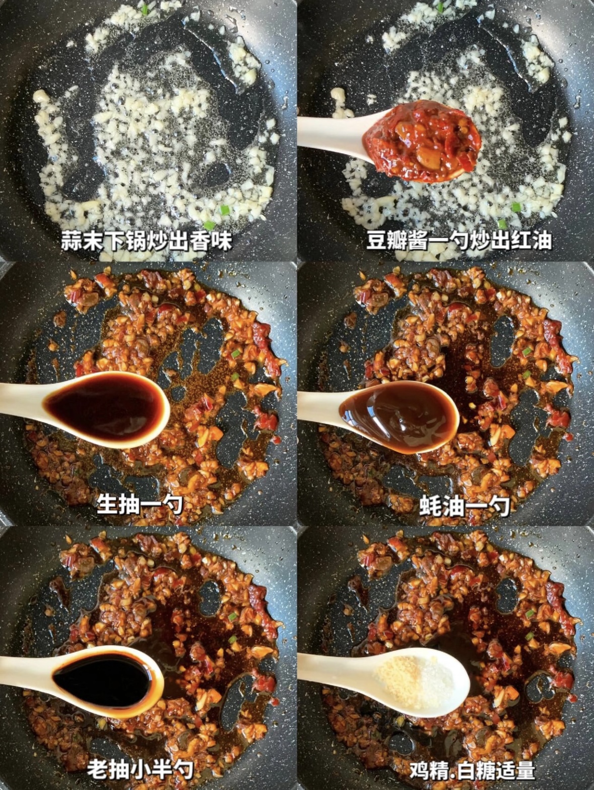 正式开炒。锅里两勺油,别省,豆泡吃油才香。油温五成热(筷子插进去冒小泡),下蒜末“滋啦”一声,香味像烟花炸开;紧接着豆瓣酱入锅,小火炒15秒,红油瞬间把蒜末染成晚霞色。这时候把火调到中大,倒入酱汁,汤汁一滚,颜色“噌”地亮起来,像给锅子开了十级滤镜。