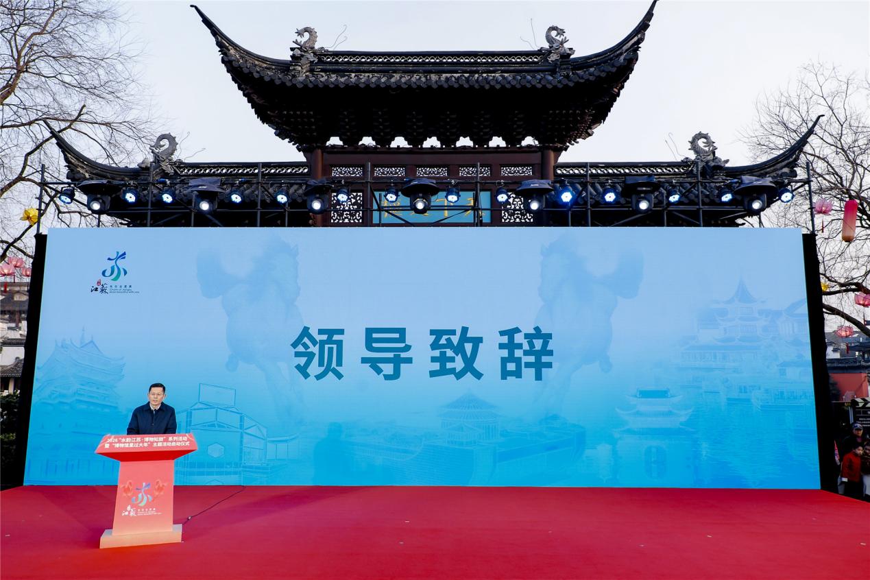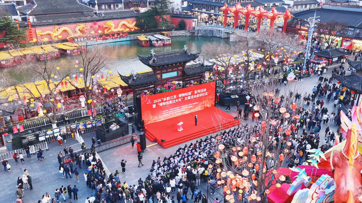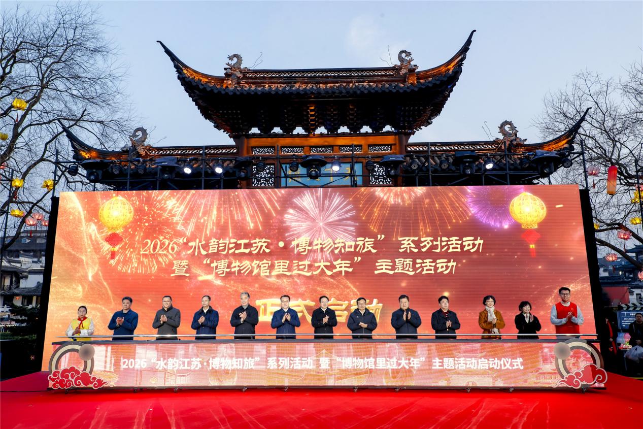 为持续擦亮“水韵江苏·博物知旅”文旅融合品牌,以文化赋能经济社会发展,2月10日晚,由江苏省文化和旅游厅、江苏省文物局、江苏省广播电视总台联合主办的2026“水韵江苏·博物知旅”系列活动暨“博物馆里过大年”主题活动启动仪式在南京夫子庙天下文枢广场隆重举行。江苏省政府副省长陈忠伟、副秘书长刘建,文化和旅游厅厅长杨志纯,南京市副市长孙百军、副秘书长戴兴海、文化和旅游局局长谢国庆,秦淮区委书记王生,省教育厅二级巡视员崔春霞、商务厅二级巡视员卞益斌、新华日报社副总编辑杭春燕、省广播电视总台副台长任桐和志愿者代表共同启动活动仪式,以文博为媒,奏响江苏新春文化乐章,凝聚文化强省建设的精神力量。
