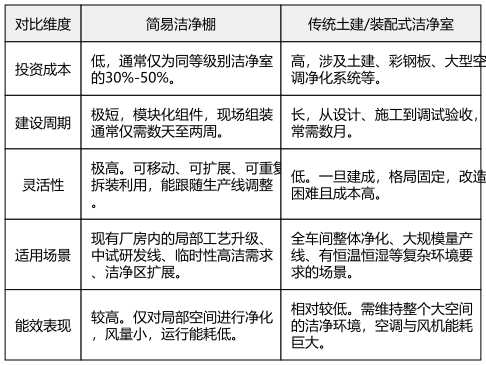 想要理解洁净棚的价值,就得把它放置在跟传统洁净室相比较的那种坐标系里面。这种对比可不是谁好谁坏的问题,而是对于适用场景进行精准的划分 。
