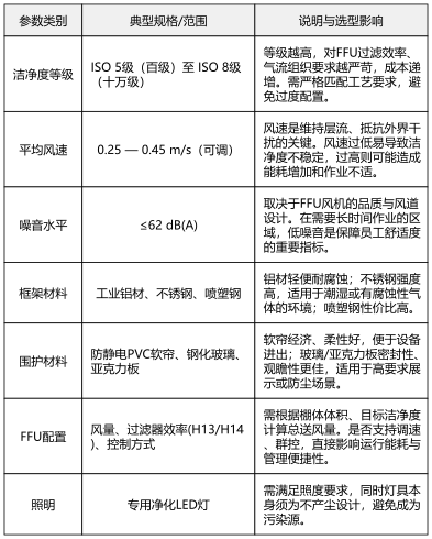 挑选一款恰当的洁净棚,不能仅仅依靠感觉,务必要依据能够量化的工程参数。下面的表格汇总了关键的选型参数以及其典型的范围,这些数据是开展科学决策的根基。