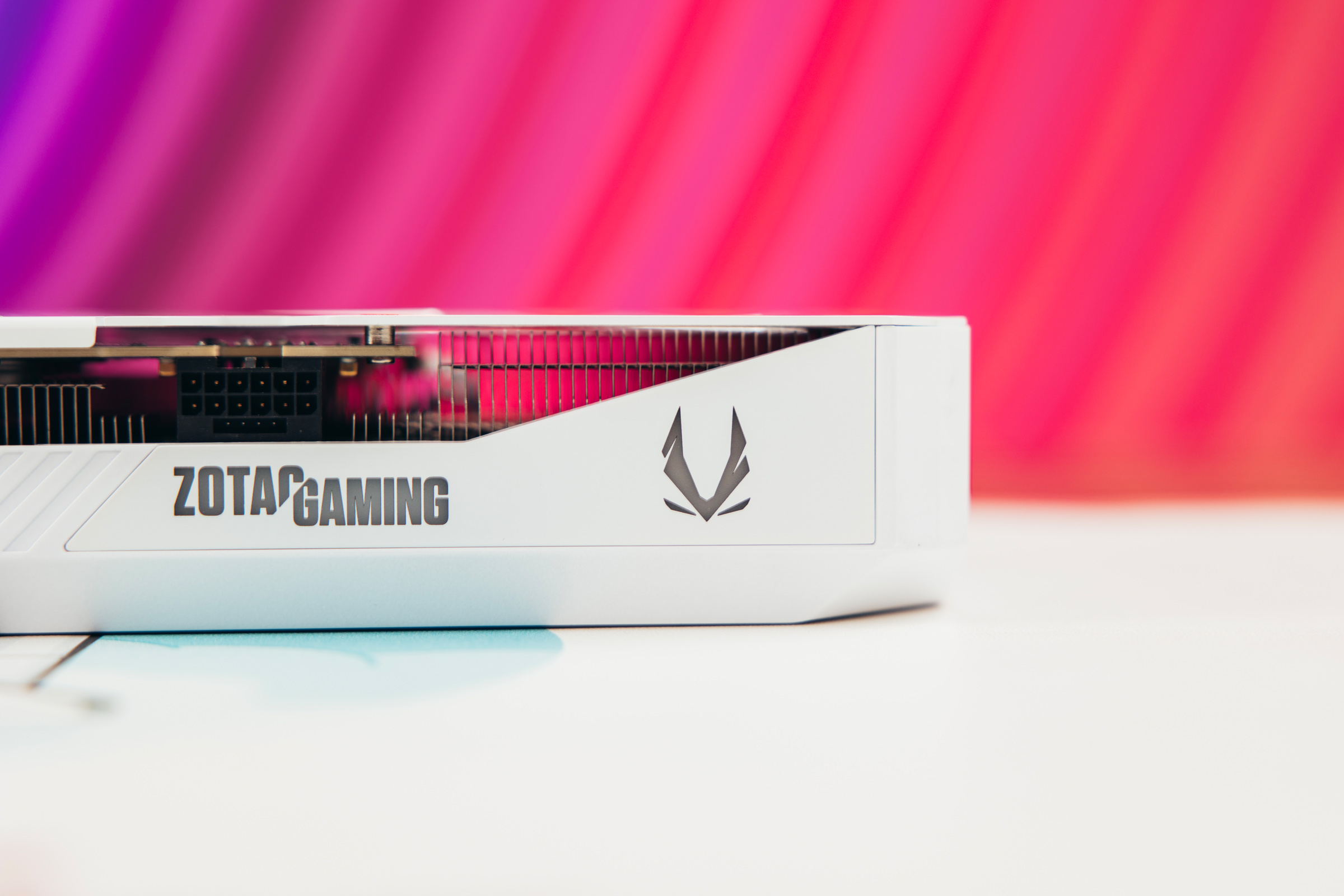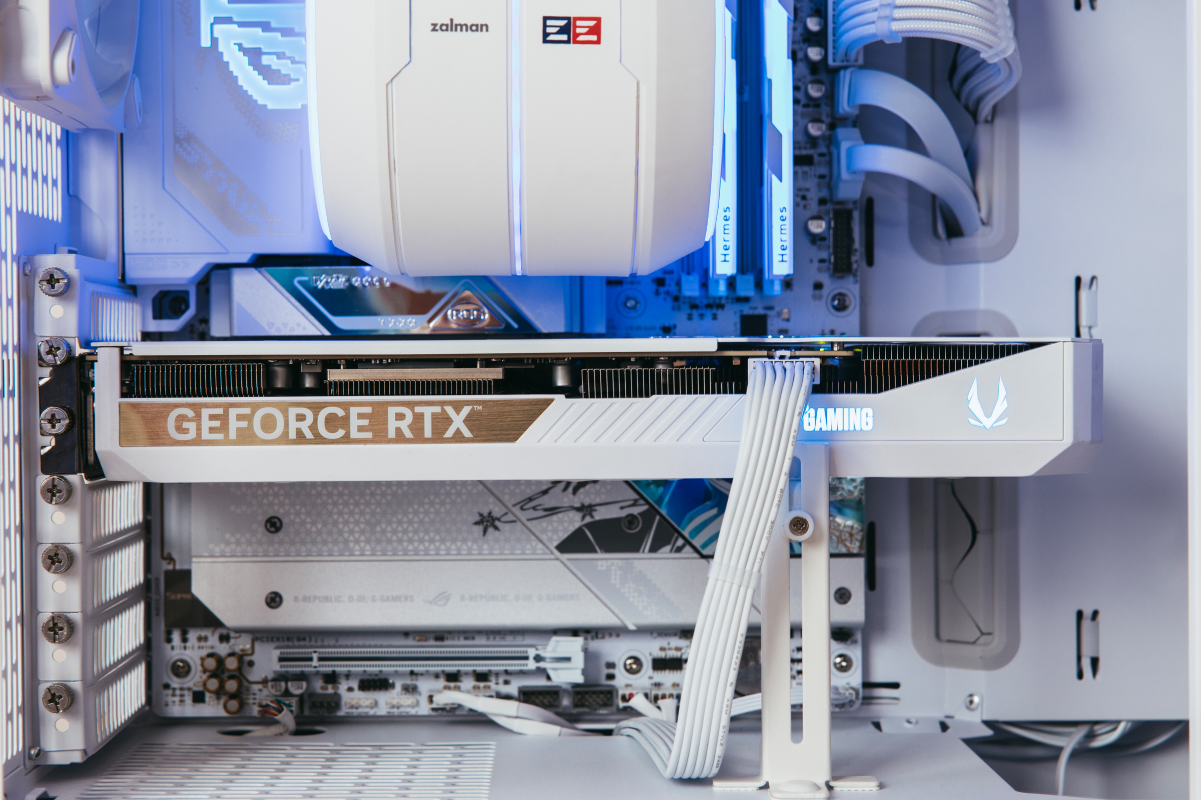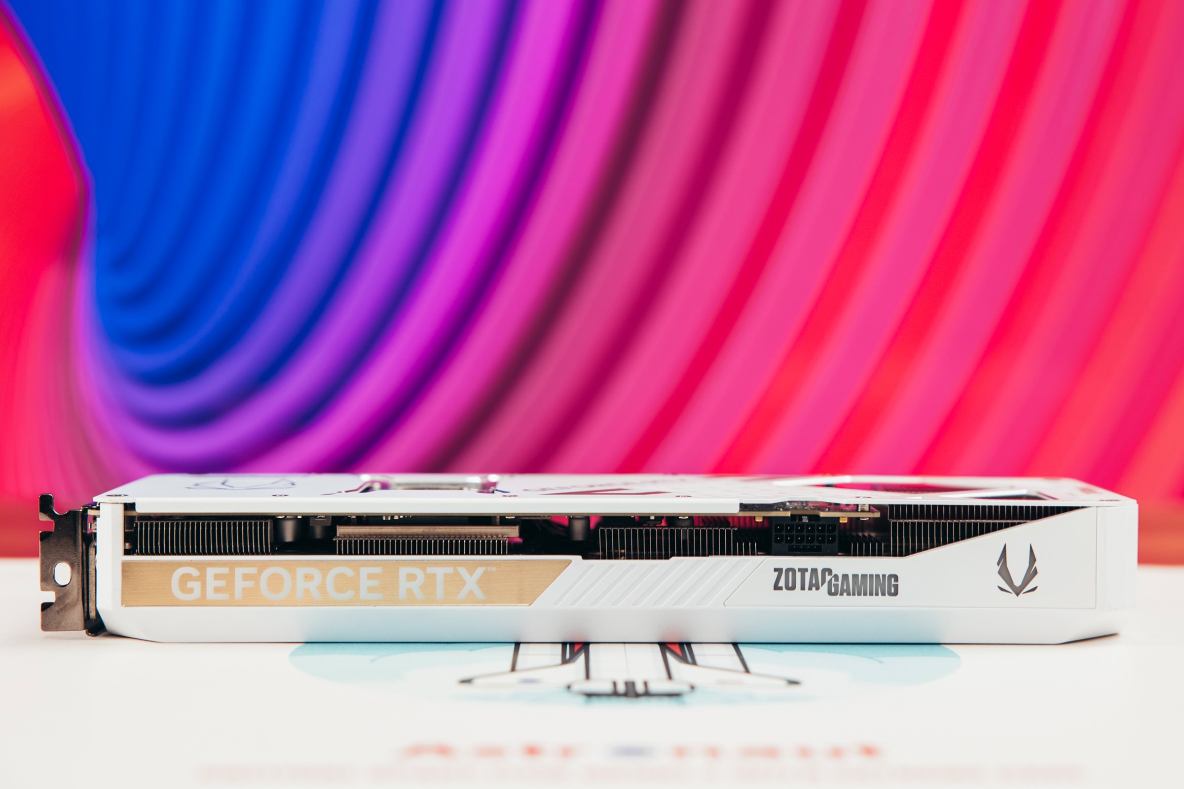 索泰 RTX 5070 Ti 16GB SOLID CORE OC WHITE侧面一览,双槽显卡在在这个机箱里甚至显得有些纤薄。