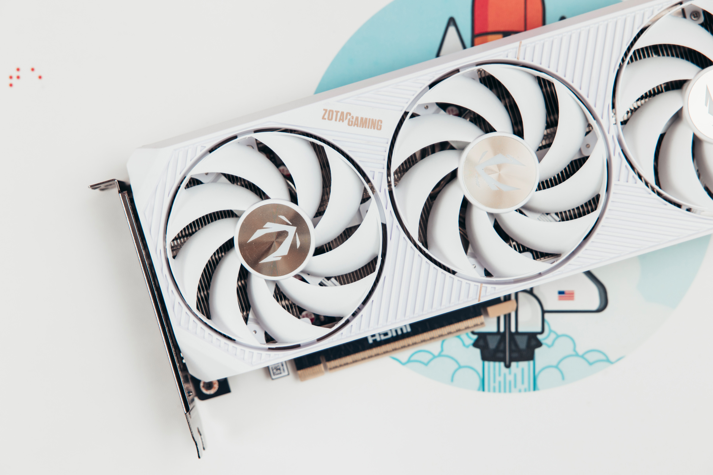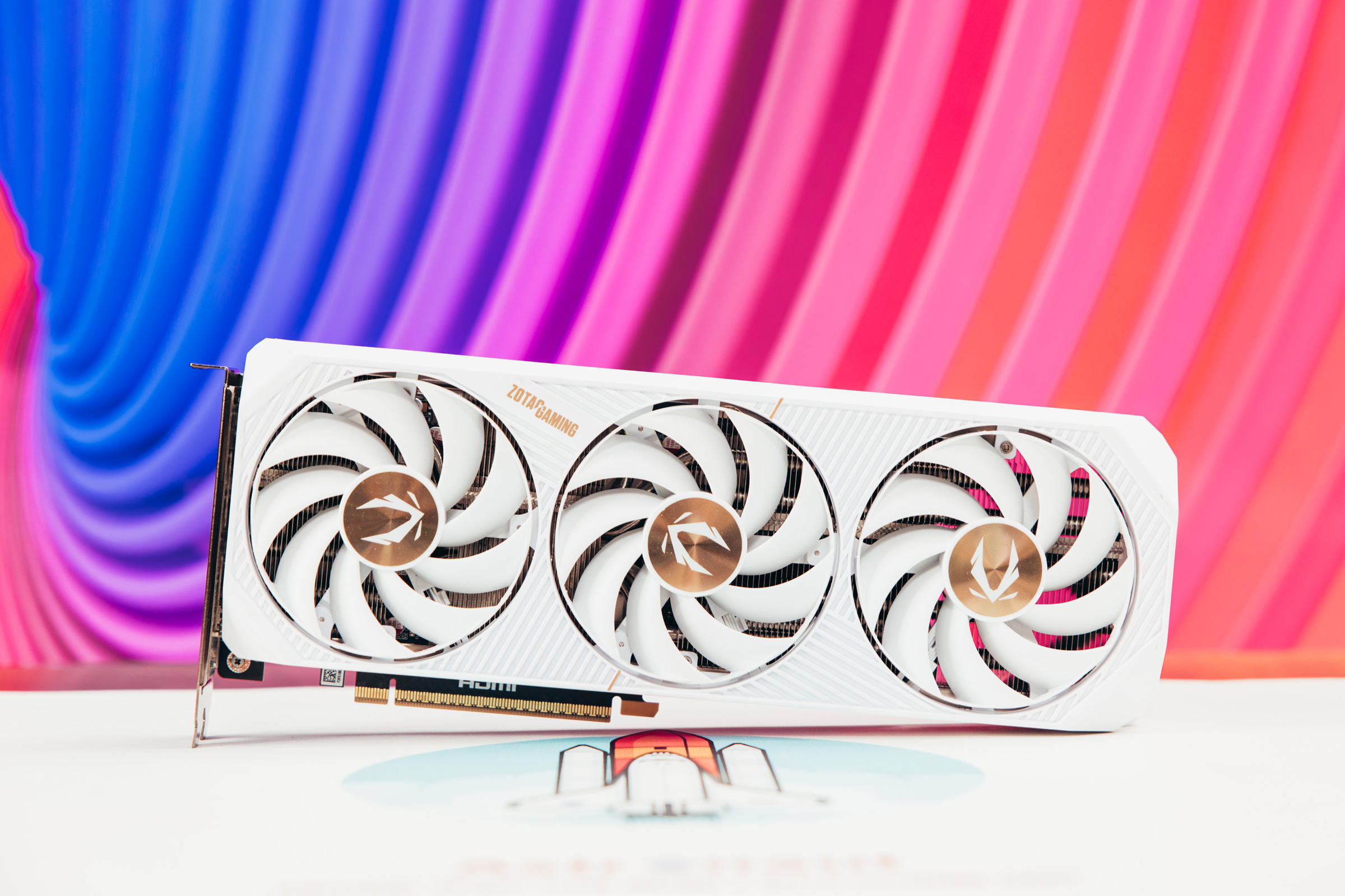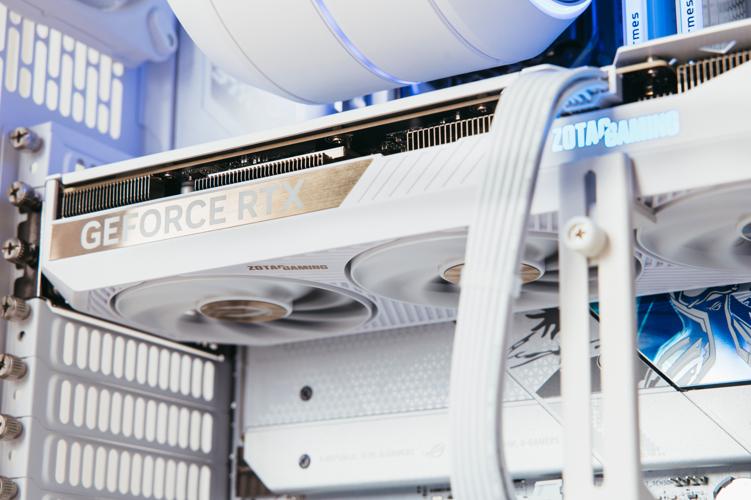 索泰 RTX 5070 Ti 16GB SOLID CORE OC WHITE侧面一览,双槽显卡在在这个机箱里甚至显得有些纤薄。