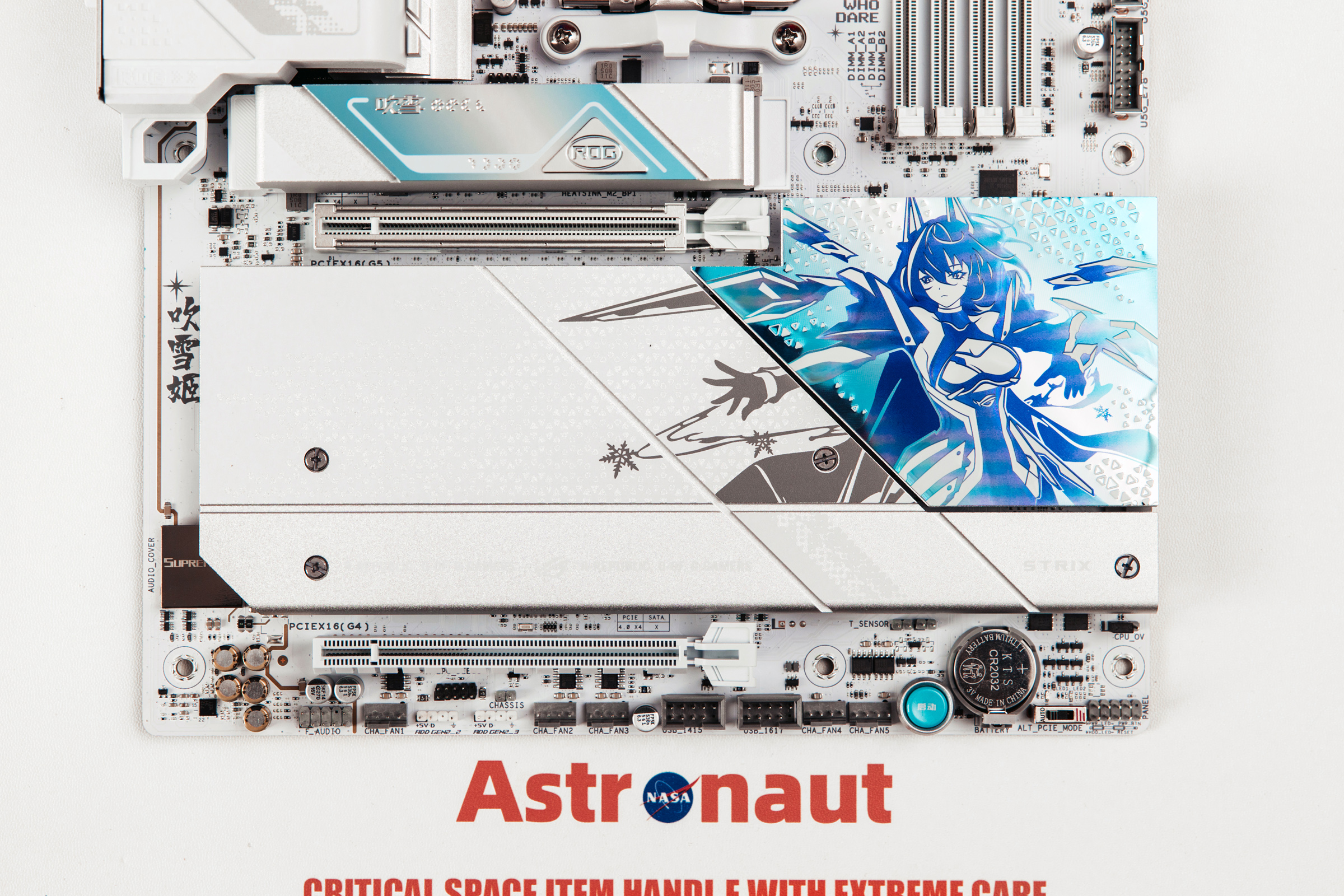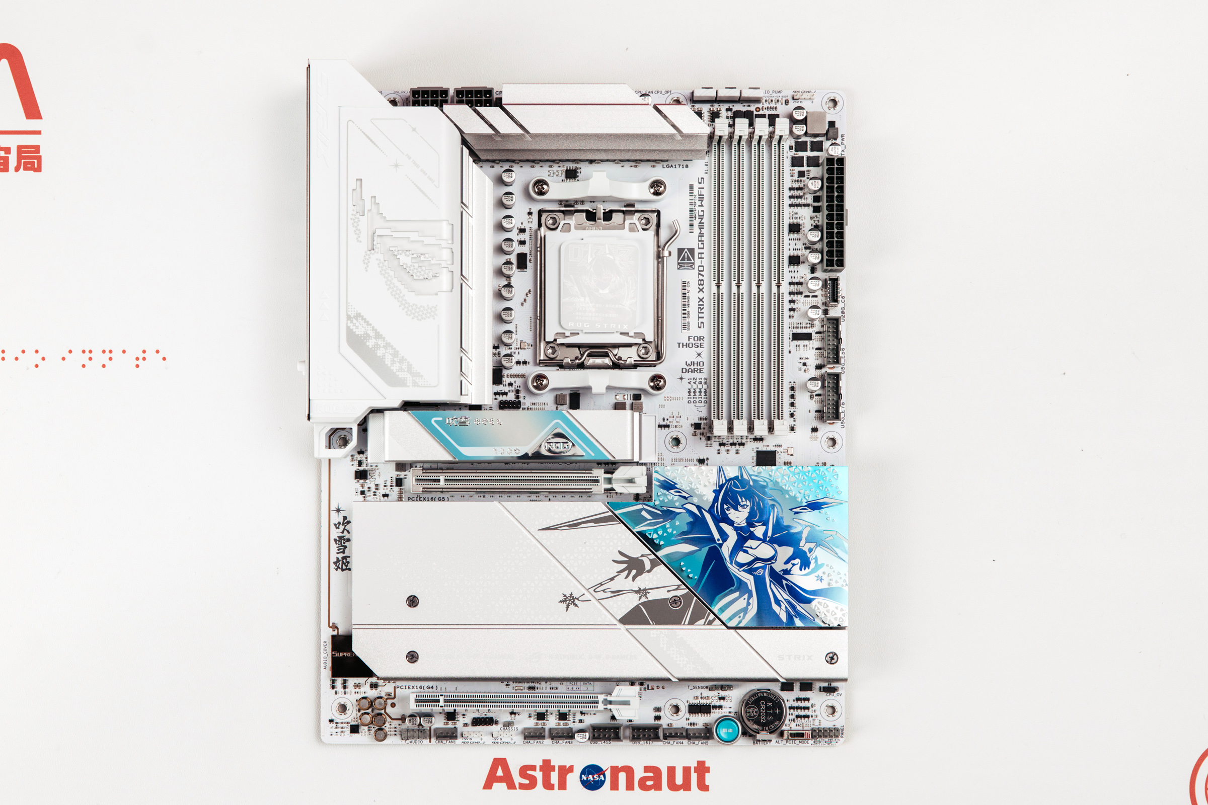 大面积散热装甲雪武战姬立绘清晰可见,VRM和IO上方区域装甲败家之眼发光像素,和周围的装饰性元素交汇,有着丰富的层次感。