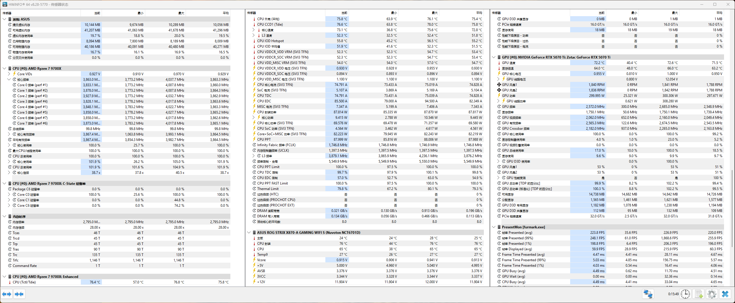 在双拷测试中,显卡温度表现为平均温度71.5度,功耗300W拉满了,思民ZET5散热器加持下,9700X这颗处理器温度也可以维持在平均75.4度左右。