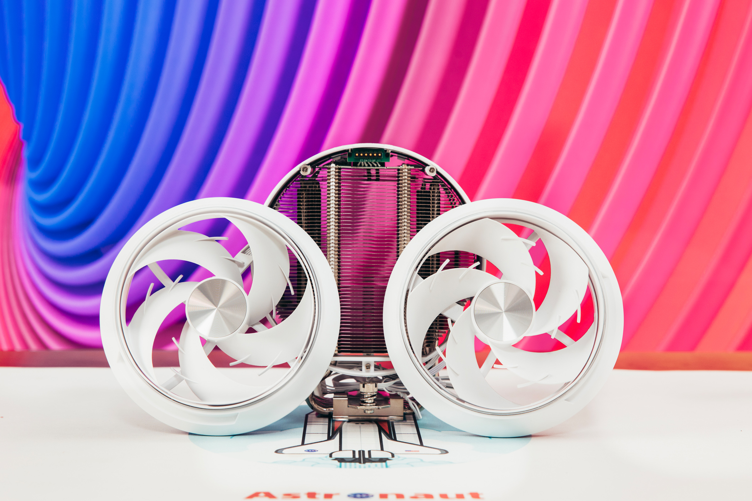 风扇和散热鳍片主体融为一体,中间有一根RGB灯带,连带前后风扇模块各一根灯带,一共3根灯带,整体圆润富有美感。