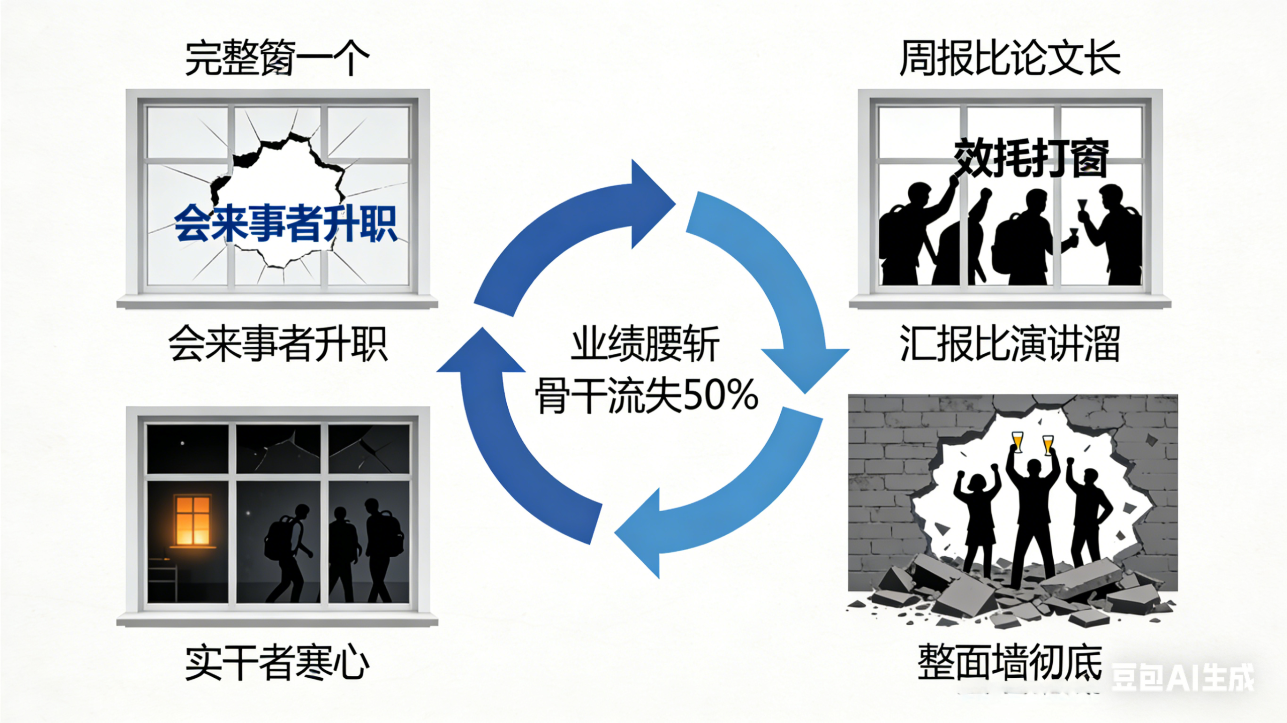 第一步:破窗一个“会来事但不出活”的人意外升职。茶水间开始流传:“踏实干活没用,讨好领导才是捷径?”第二步:效仿聪明人最懂“顺势而为”。他们开始重“表演”轻“实干”:周报写得比论文长,汇报说得比演讲溜,实事没做几件。第三步:寒心实干派彻底崩塌:“我熬夜解决客户问题,不如别人在会上说句漂亮话;我拿下百万订单,不如别人陪领导吃顿饭。”第四步:崩塌当骨干走光,留下的全是深谙“生存术”的演员。他们会招聘同类,提拔同类。公司基因,就此彻底改写。