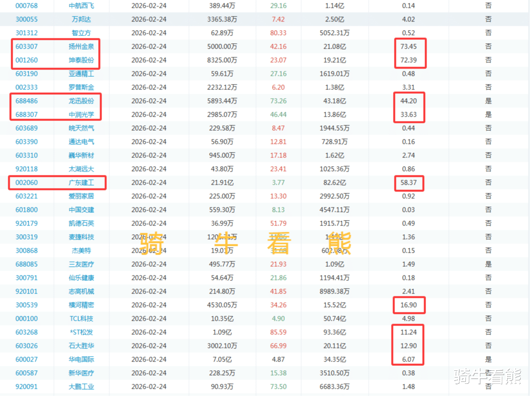 2月24日(周二)帝奥微解禁比例达到22.61%;浩瀚深度解禁比例达到36.32%;熵基科技解禁比例达到47.17%;海正生材解禁比例达到38.76%;远翔新材解禁比例达到46.69%;亿道信息解禁比例达到62.13%;扬州金泉解禁比例达到73.45%;坤泰股份解禁比例达到72.39%;龙迅股份解禁比例达到44.2%;中润光学解禁比例达到33.63%;广东建工解禁比例达到58.37%。
