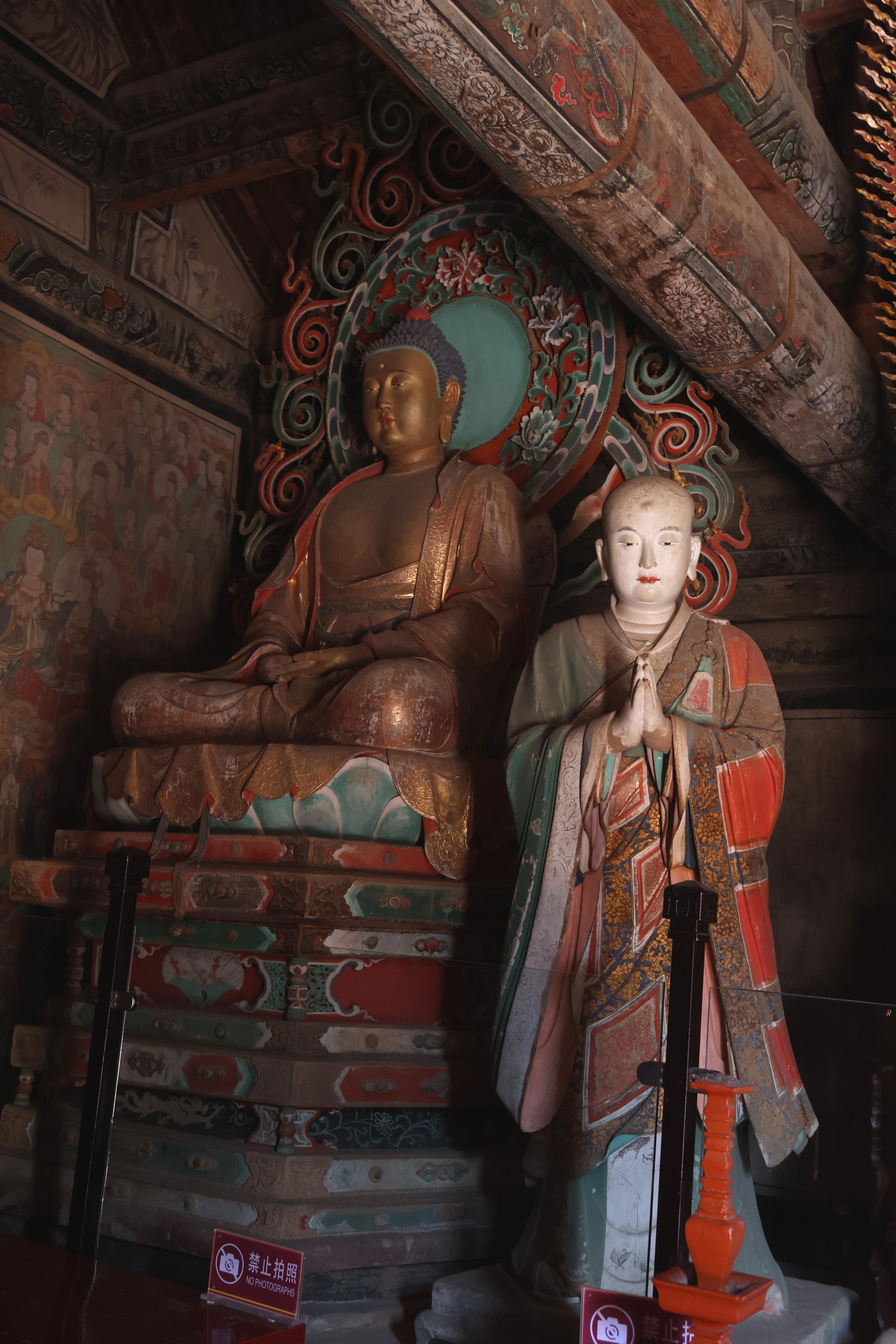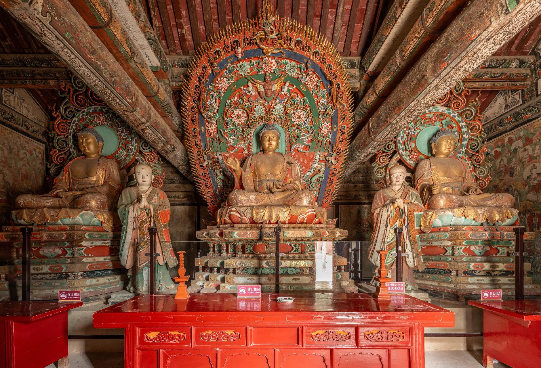 大殿中央的佛坛上,三身佛彩塑静静伫立,毗卢遮那佛、卢舍那佛与释迦牟尼佛并列而坐,形体丰满,姿态端方。造像的衣纹流畅自然,仿佛带着微风拂过的动感,从肩头垂落的褶皱层次分明,既符合人体结构,又透着超凡脱俗的飘逸。释迦牟尼佛前的迦叶、阿难二尊者侍立两侧,迦叶尊者神态坚毅,尽显“苦行头陀”的气质,阿难尊者则面带温和,透着聪慧机敏。这些塑像的塑造工艺堪称精湛,指尖的弧度、眼睑的低垂、嘴角的微扬,每一处细节都刻画得恰到好处,让人忍不住感叹明代塑匠的高超技艺。最奇妙的是,这些彩塑与四壁的壁画形成了完美的呼应,佛坛上的佛像与壁画中的主佛遥遥相对,塑像的衣纹色彩与壁画的色调相互协调,仿佛画中的人物正要走下墙壁,而坛上的塑像正要步入画中,构成了“塑绘合一”的绝妙境界。