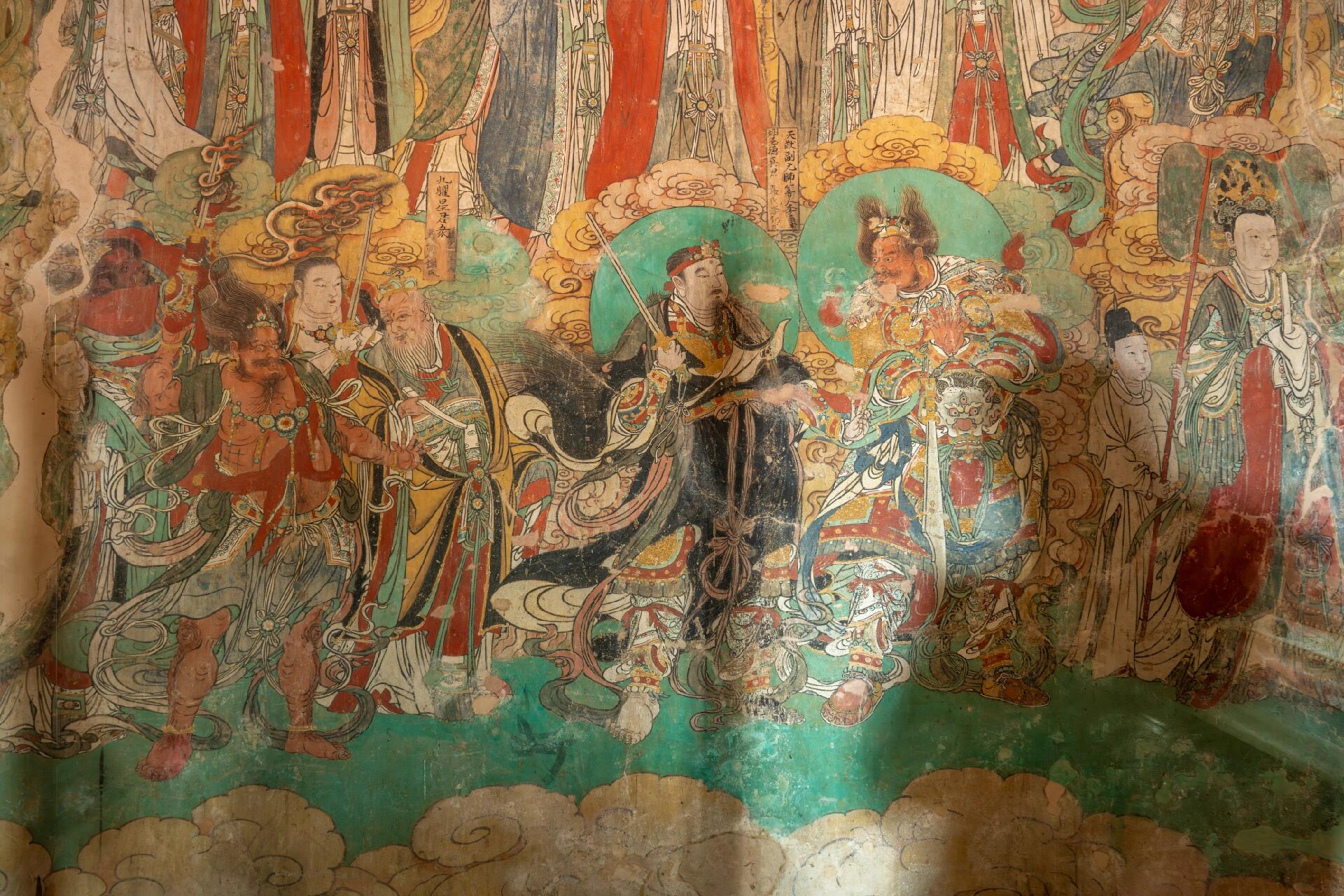 在用色上,壁画以40%的青绿色为主调,搭配30%的朱红色与30%的其他色彩,冷暖交织间透着和谐庄重。历经数百年风雨,这些矿物颜料依旧鲜艳,青绿色沉静如古玉,朱红色热烈而不张扬,色彩的层次在光影中不断变化,仿佛画中的世界正在缓缓流动。更令人称奇的是,壁画中的法座须弥台运用了焦点透视的创作手法,在明代绘画中实属罕见,这种理性的绘画技巧与感性的艺术表达完美融合,让平面的壁画生出立体的纵深感。东壁南上角的壁画题记清晰记录着画匠的名字:戎钊、高升、高进、张鸾……这些来自民间的匠人,没有留下生平记载,却用手中的画笔在墙壁上留下了不朽的作品,他们细致入微地观察生活,一丝不苟地刻画细节,将对信仰的理解与对艺术的追求都倾注在每一笔色彩、每一根线条中。