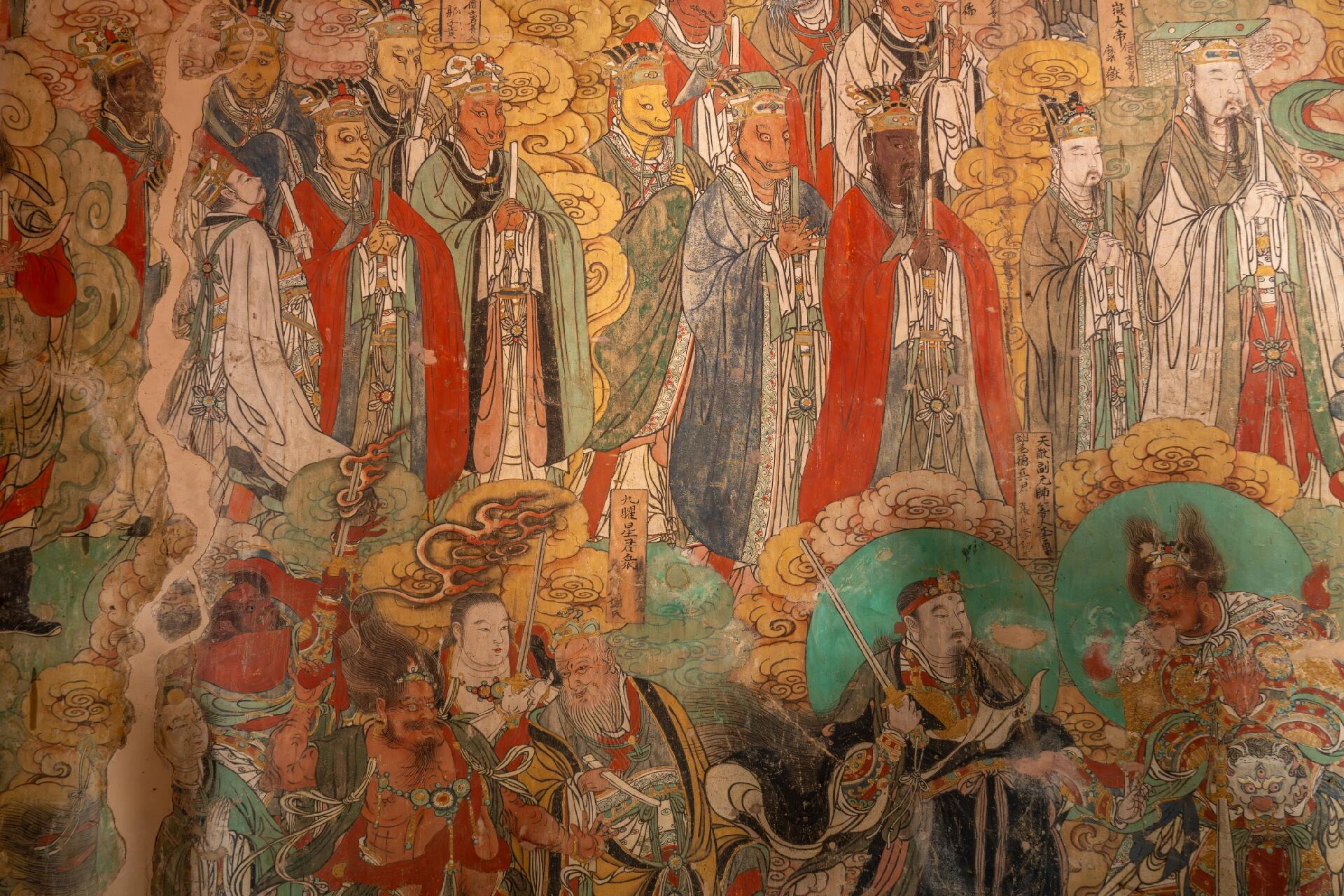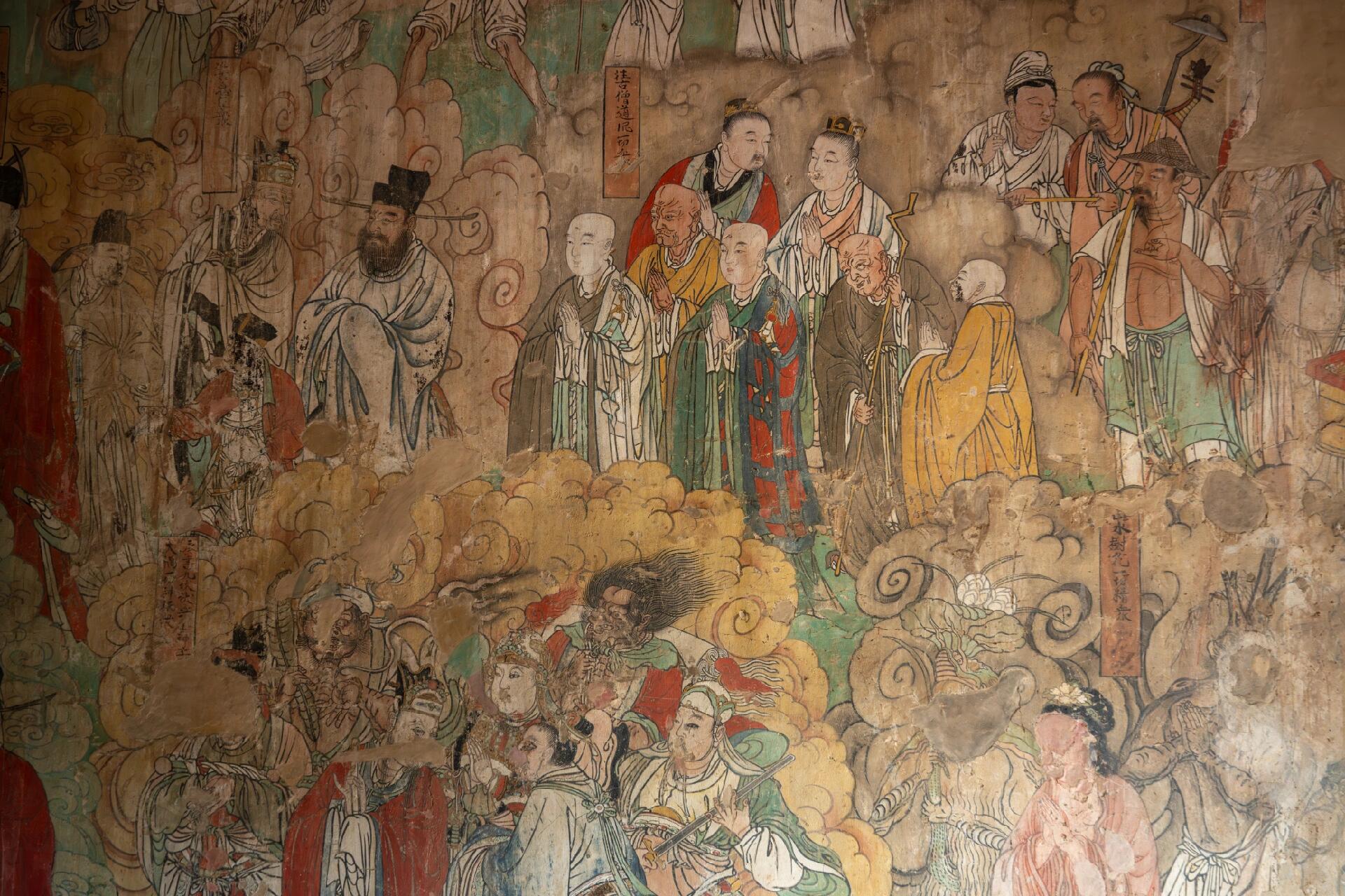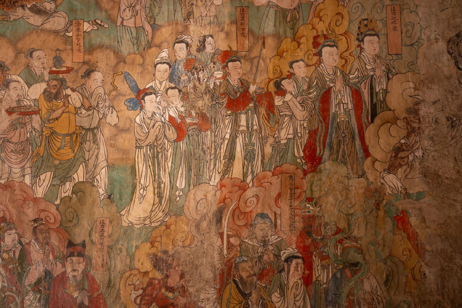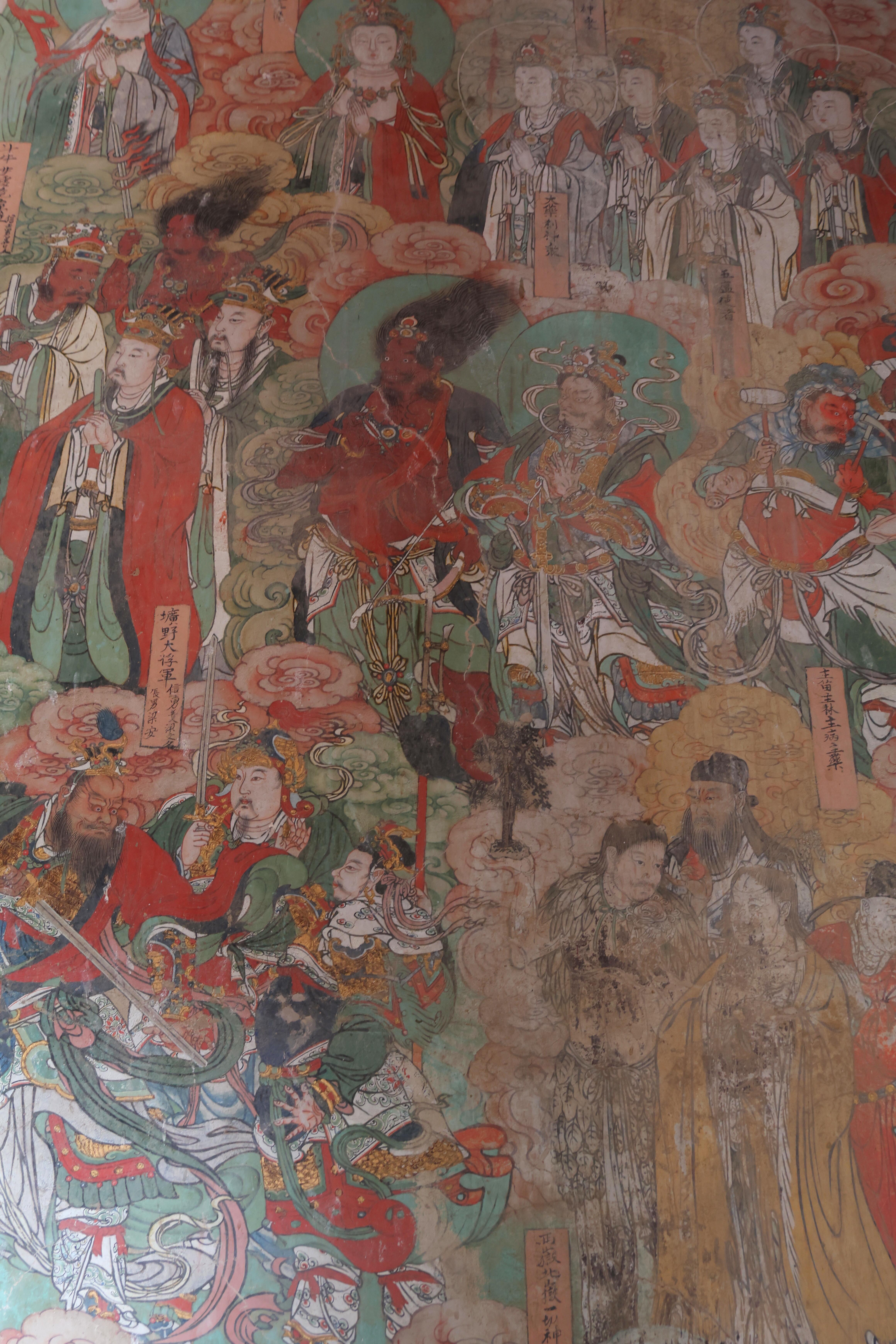 站在大雄殿中央,环顾四周的壁画与彩塑,一种跨越时空的震撼感油然而生。壁画中的“天龙八部”位于十八罗汉下方,这八位临近佛祖的神仙姿态各异,与武侠小说中演绎的形象截然不同,让人不禁思考,真正的宗教文化与后世的艺术再创作之间,究竟存在着怎样的关联。北壁的十大明王形象威猛,神情凶悍,却在眉眼间透着慈悲,这种矛盾而统一的表达,是否正是古人对“惩恶扬善”的理解?南壁绘制的往古人伦与冥界众生,帝王后妃、文武贤臣、疆场将士与遭遇天灾人祸的众生一同赴会,这种跨越阶层、跨越生死的场景排布,又暗含着怎样的生命观与价值观?