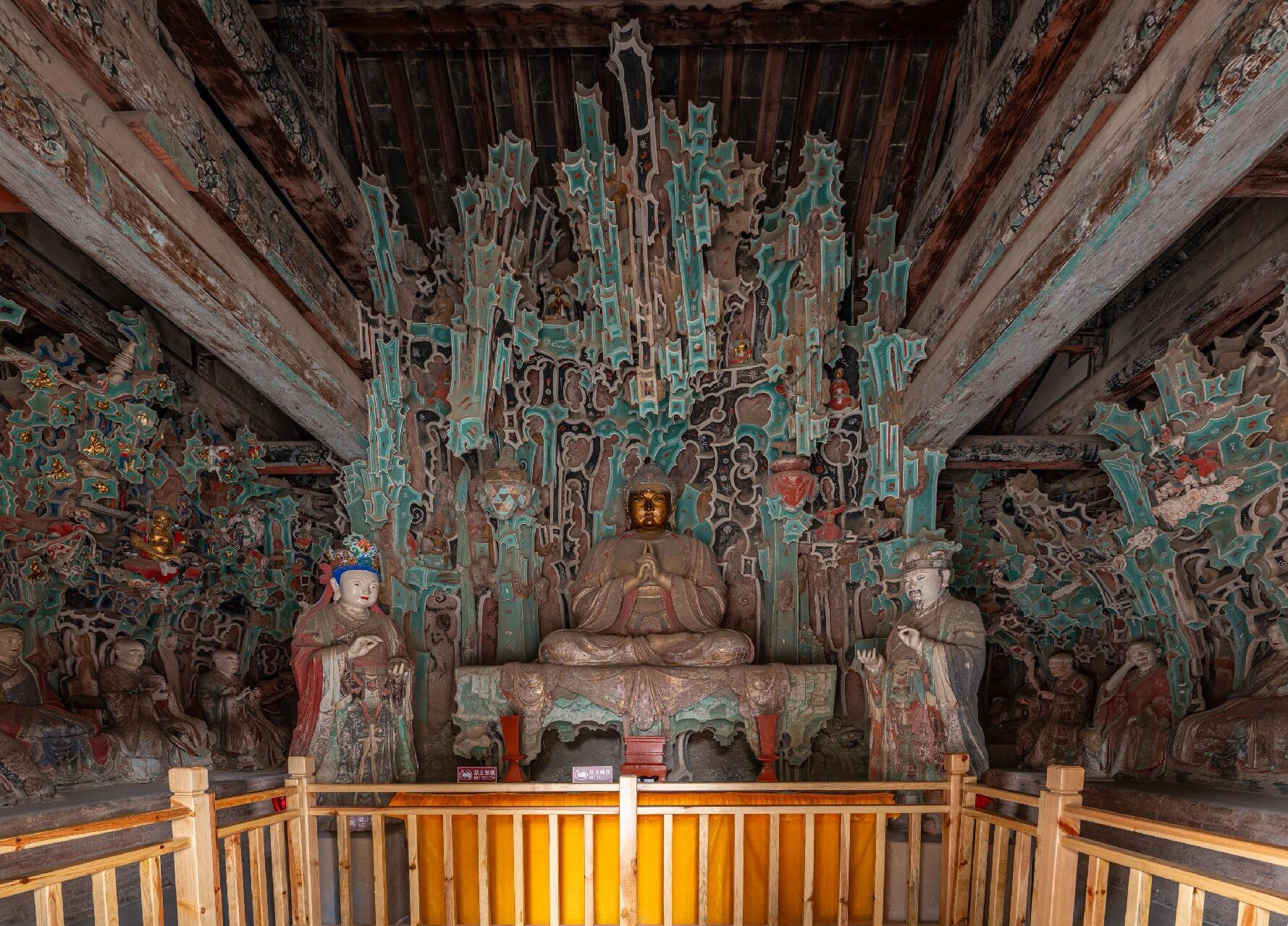 推开毗卢殿厚重的木门,一股混合着木屑与香灰的气息扑面而来。殿内正中,释迦牟尼坐像结跏趺坐,神态安详得仿佛阅尽千年沧桑,左右两侧的大梵天王与帝释天王手持法器,身姿挺拔,铠甲上的纹路清晰得能看清锻造时的凿痕。转身望向背后,观音菩萨低眉垂目,似在聆听众生祈愿,环绕殿内的文殊、普贤菩萨及十八罗汉塑像,或手持经卷沉思,或袒胸露腹大笑,每一尊都带着独有的神态气质。最令人称奇的是塑像上方的悬塑,山水层叠,亭台错落,仙人与灵兽穿梭其间,塑匠以泥土为笔,将山石的纹理、树叶的脉络、人物的衣褶一一呈现,色彩虽历经数百年,却依旧在昏暗的殿内泛着温润的光泽。这些塑像并非孤立存在,它们与殿内的梁柱、窗棂相互呼应,与墙上隐约可见的壁画残痕彼此映衬,让人忍不住猜想,当年的工匠在塑造这些形象时,是否早已构思好了这份立体与平面的对话。