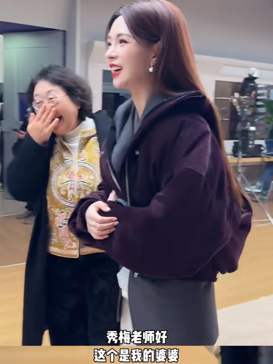 婆媳俩进去的时候,殷秀梅正在拍照,两人很有礼貌的在一旁等候。等到拍完照,一向开朗活泼的涛妈却害羞了起来,也不敢主动上前打招呼。儿媳妇沈梦辰看后赶紧过去打招呼,表明自己的来意,与殷秀梅老师说婆婆很喜欢她。