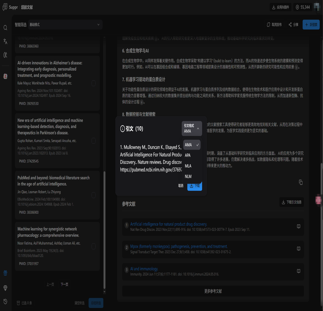 搜索结果出来后,不只是给你一堆文献列表,还会自动生成中文摘要总结和研究思维导图。思维导图可以一键下载,帮你快速梳理这个领域的研究脉络。文献引用也自动处理好了,支持AMA、APA、MLA、NLM等各种格式,复制粘贴就能用。