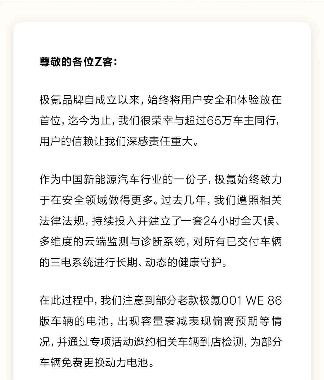 比起还没有出现的问题,极氪率先召回预防,其实大部分001车主可能更关心自己在不在召回的范围里。毕竟换完新电池,等于又是一辆“新车”了,这种羊毛应该所有新能源车主都想薅到吧。