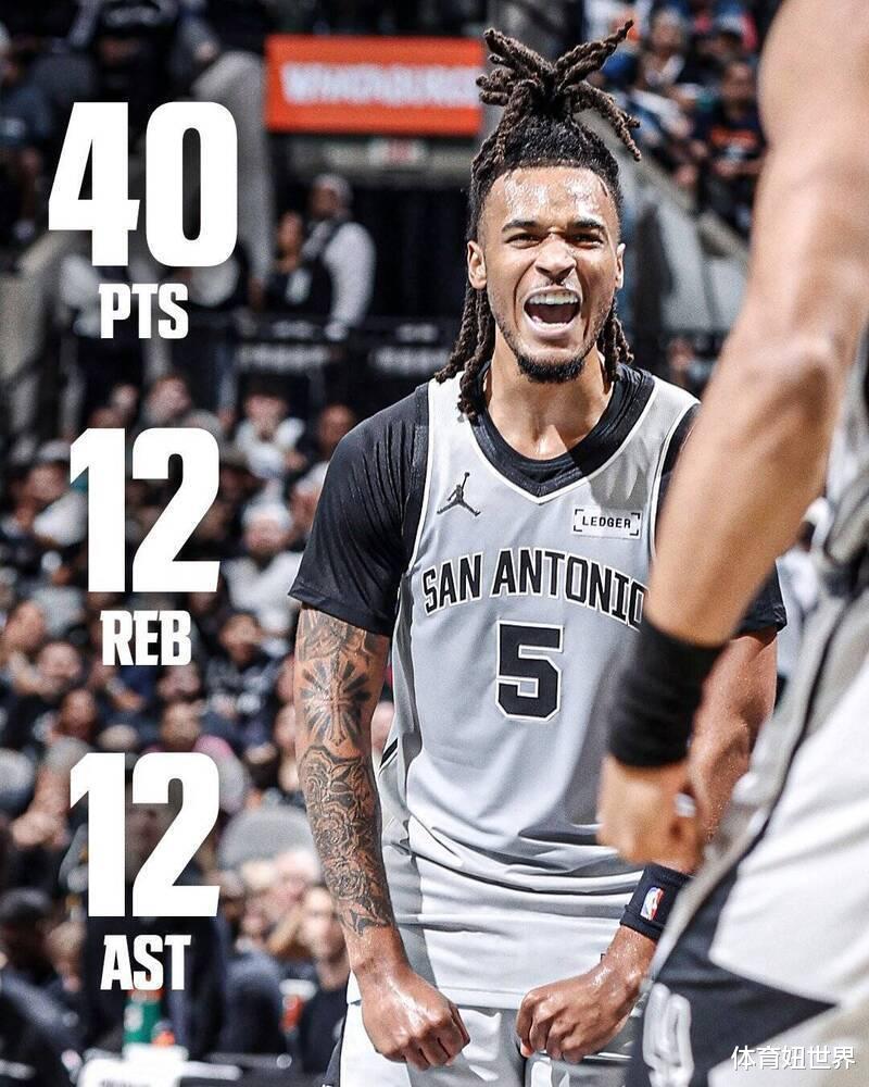马刺今天在德州德比以138:125打败独行侠,收下近期4连胜,马刺21岁新星城堡哥卡斯尔狂飙40分三双,写下多项神奇纪录。