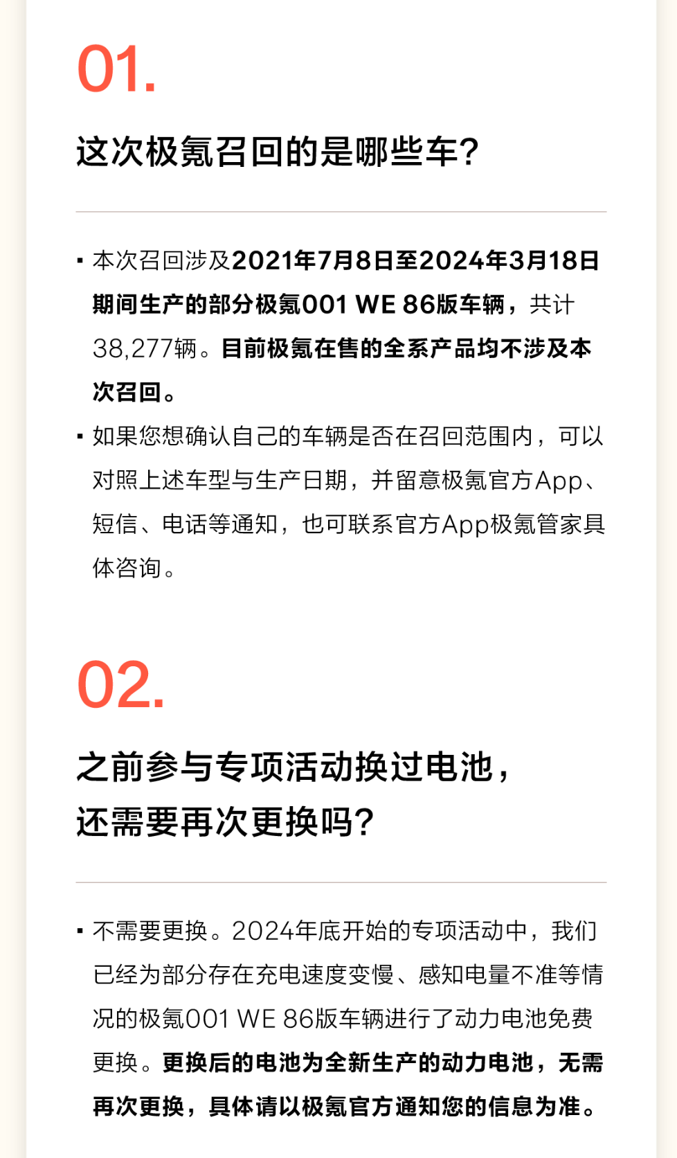 而此次极氪召回的车型为2021年7月8日至2024年3月18日生产的极氪001 WE86版车型,共计38277辆车,核心问题是特定批次动力电池因内部部件制造一致性原因,长期使用后内阻异常升高,可能导致性能下降甚至安全隐患。并且极氪也表示之前首任车主的三电终身质保依旧延续,非首任车主则继续享有8年或20万公里的三电系统质保。此外在24年更换过动力电池的车辆无需再次更换。