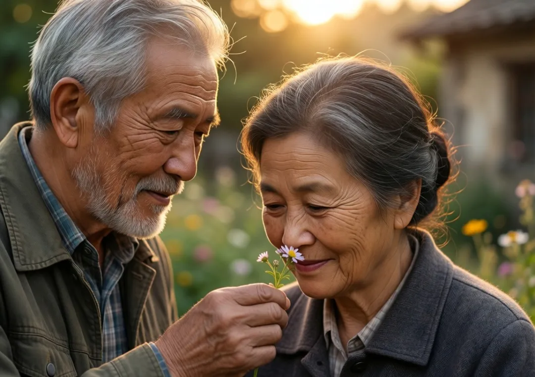 一位白发苍苍的老奶奶,午后坐在院里的藤椅上打盹。老伴散步回来,手里捏着几朵刚摘的野雏菊,轻轻放在她膝头。她睁开眼,愣了一下,然后嘴角慢慢、慢慢地扬起来——那个笑容,恍惚间让你看见了她十六岁的模样。
