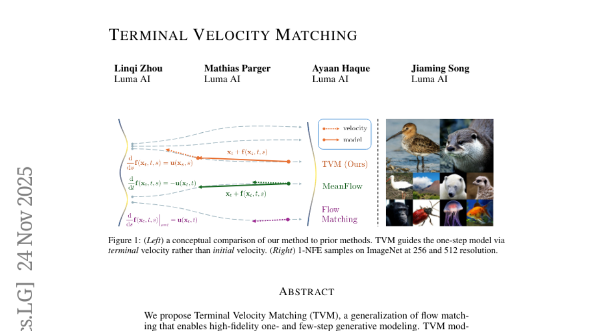 Luma AI的研究团队提出了一个全新的解决方案,他们称之为"终端速度匹配"(Terminal Velocity Matching,TVM)。这个名字听起来很技术化,但其实它的核心思想非常直观。传统的生成方法就像一个学生在考试时需要一步一步解题,而TVM则像是一个经验丰富的专家能够直接跳到答案。更准确地说,传统方法关注的是"起点"的速度和方向,而TVM创新性地关注"终点"的速度和方向,从而实现了从起点直接跃至终点的能力。