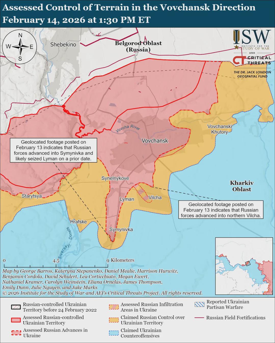 2月13日发布的地理定位录像显示,俄军近期推进至北锡米尼夫卡境内,以及维尔恰北部和西北部(均位于哈尔科夫市东北部)