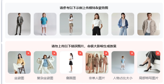 1.AI模特试衣及穿戴合成:该模式是基于人工输入商品图片(如服装单品图),由系统直接将所传入的商品图片合成为穿于模特身上并呈现相应姿态的效果图;