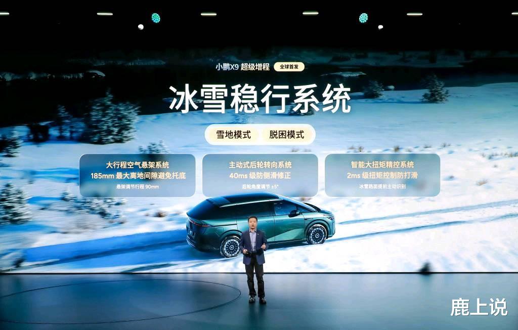 其搭载的冰雪稳行系统,带来雪地模式及脱困模式。通过185mm最大离地间隙的大行程空气悬架系统、毫秒级响应的后轮主动转向系统以及智能大扭矩系统的协同配合,小鹏X9超级增程能实现雪地结冰路面不打滑,即使是10cm雪坑后轮陷车,也能顺利脱困。