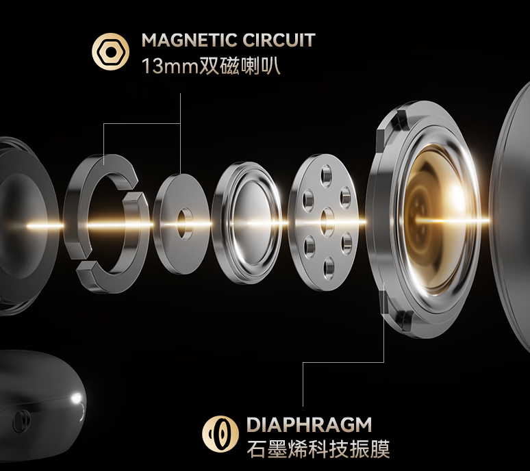 耳机的单元也就是喇叭对于耳机的音质影响最大,通常来说,耳机喇叭的尺寸越大,音质越好。同时不同材质的单元,也有着不同的特质,在选购时,我们可以关注耳机的喇叭尺寸和喇叭材质。比如石墨烯材质的单元,凭借优异的形变性能,既能让声音的层次感更细腻,也能精准还原音乐里的各种细节。所以大家选购耳机时,不妨重点关注发声单元的尺寸和材质这两个关键指标。