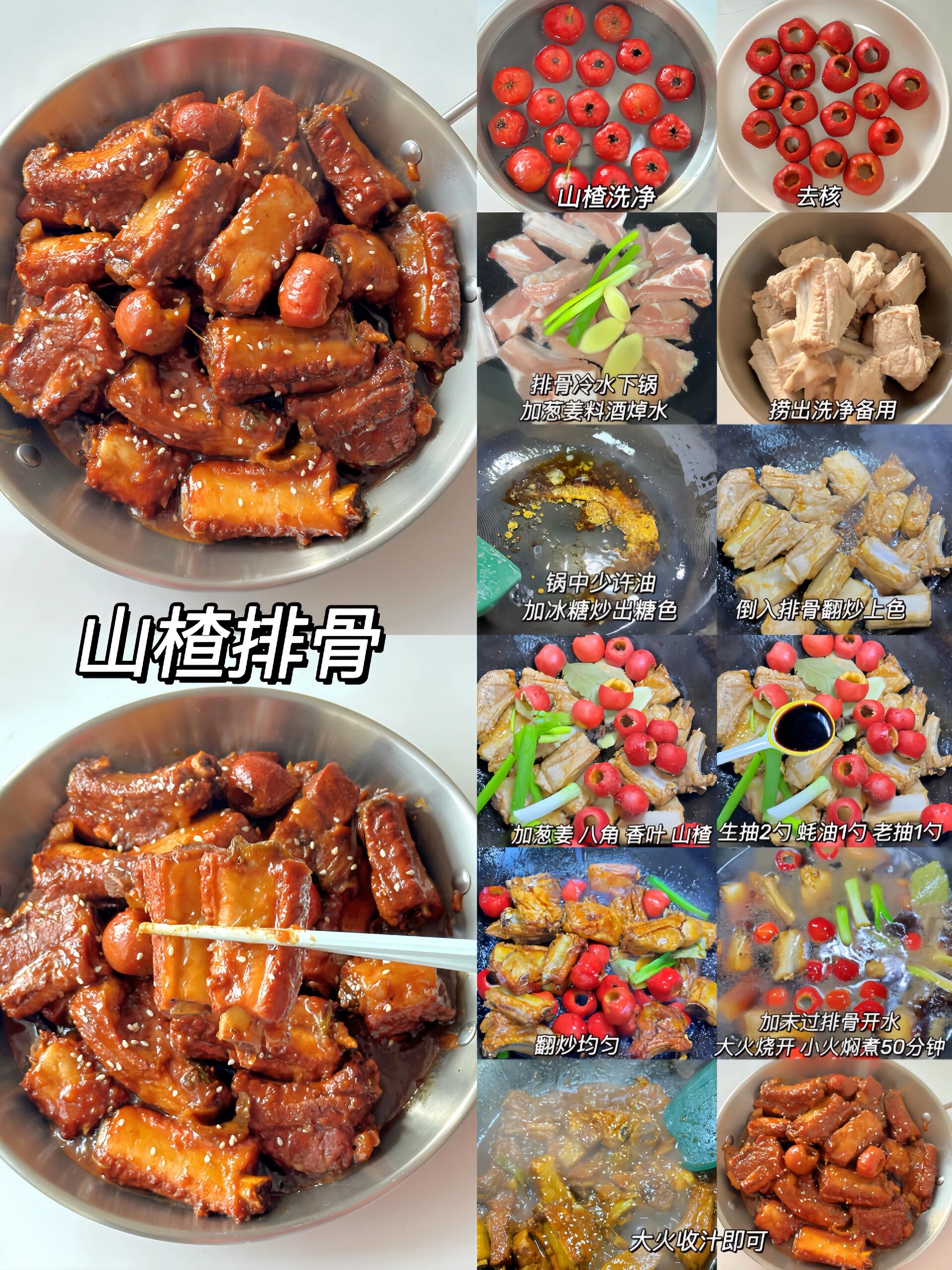 • 做法:排骨焯水,炒糖色后加山楂、八角、香叶和调料,大火烧开转小火焖50分钟,最后收汁撒芝麻。懒人技巧:山楂用新鲜的或干的都行,没有山楂用话梅代替,味道也超赞!