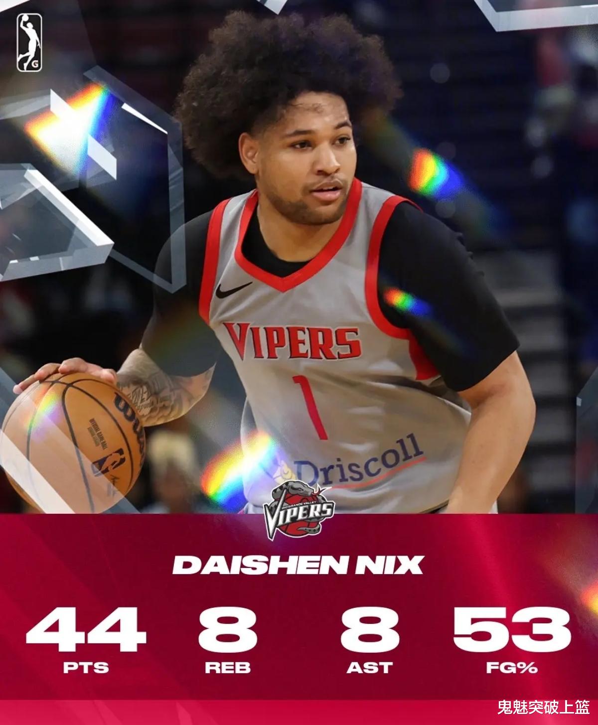 虽然戴申尼克斯没法在NBA立足,可他如今却在发展联盟闯出了一番天地!而在今日结束的一场G联盟比赛里,代表火箭下属球队里奥格兰德山谷毒蛇出战的戴申尼克斯,在攻防两端可谓是彻底杀疯!