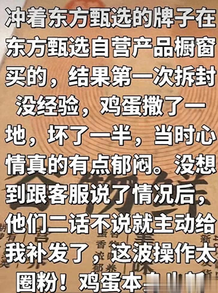 前段时间,在东方甄选自营店买了一打鸡蛋。收到快递拆包时,因为没经验,发现包装确实有点瑕疵(有网友也这么反馈过),一半多的鸡蛋撒了一地。当时没有多想,就自己清扫干净了,也没留照片。原本收到鸡蛋时心情挺好,没想到成了这样,就跟东方甄选自营店的客服反映,这次购物体验不佳。客服询问原因,便说了事情经过,还指出他们包装存在瑕疵。客服让上传照片,可当时没别的想法,自然没留。客服得知没照片后,没多说什么,只说会重新补发一打。当时真不敢相信。由于他们商品质量确实像他们直播间说的那样,再加上他们服务态度也很好,被圈粉了。从那以后,买东西都选东方甄选了。