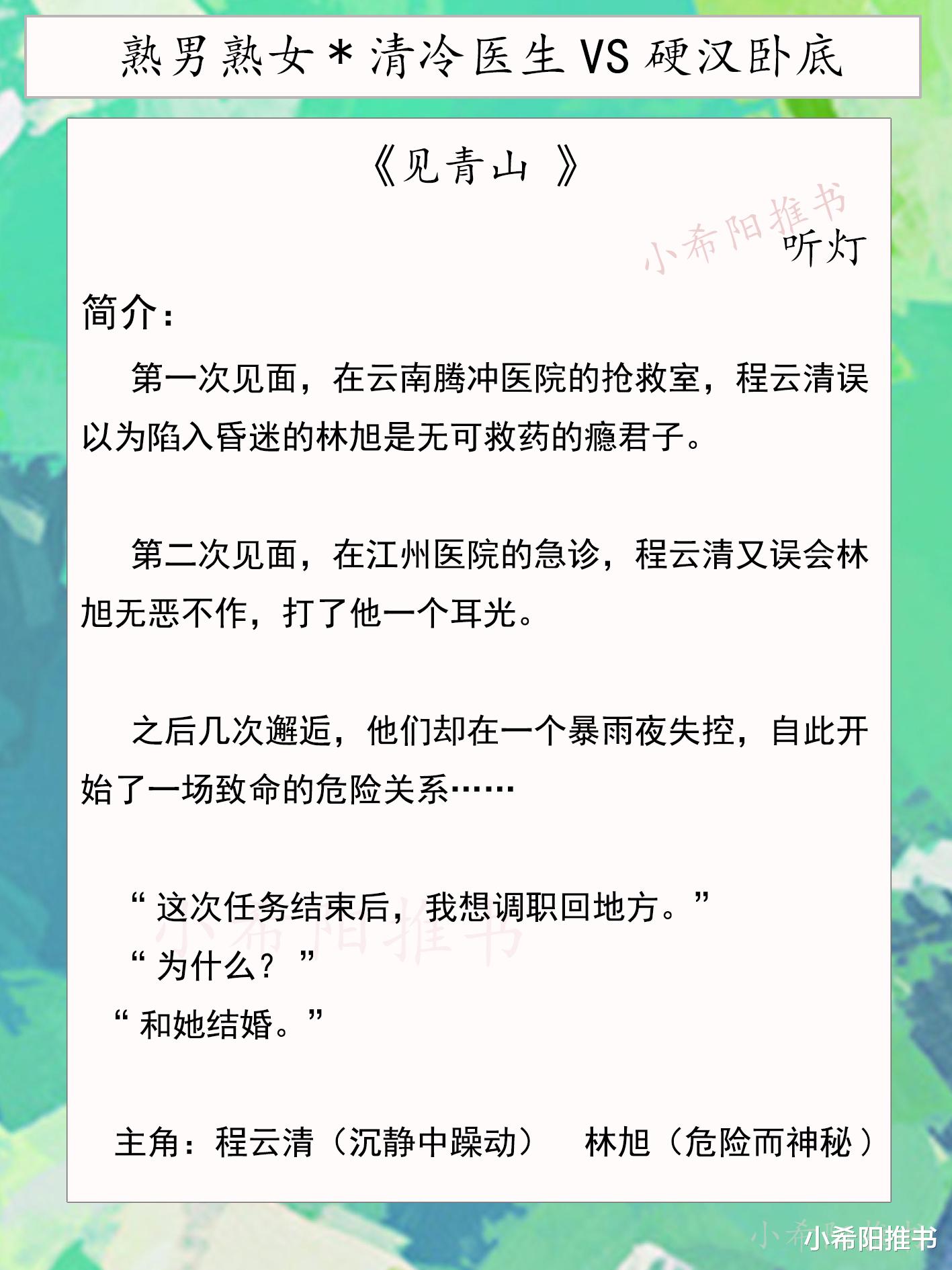 《见青山》这本小说真的蛮好看的,清冷神外医生VS硬汉卧底,成熟男女之间拉扯力比较强,危险关系张力十足,作者文笔比较好!