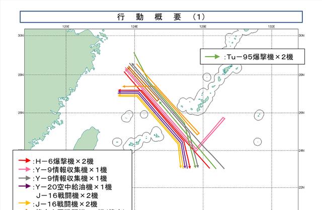 我方上午先后派出一架运9LG和运9Z先行沿宫古海峡飞行,随后派出两架轰6N战略轰炸机和两架俄方图95战略轰炸机一起从东海方向穿过宫古海峡进入太平洋,四架轰炸机进行了长时间长航程的联合飞行后又原路返回东海区域。在此期间,我方派出了四架歼16战斗机和一架运油20A空中加油机为编队护航,同时在宫古海峡上空进行了空中加油演练。