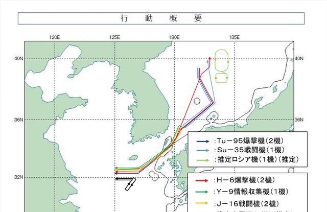 29日下午我方两架轰6N战略轰炸机与两架俄方图95战略轰炸机分别向北和向南飞行,在日本海上空汇合后,巡航编队向东海区域方向进行了长时间的联合飞行,双方在日本海飞行时,一架俄方苏35战斗机为编队提供护航,在接近对马海峡时,苏35折返,护航任务由我方两架歼16战斗机接替。