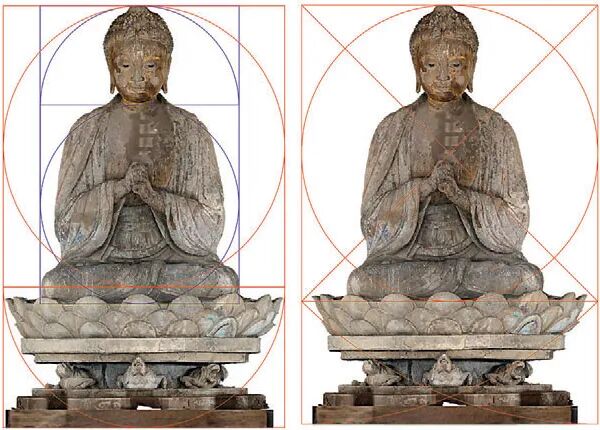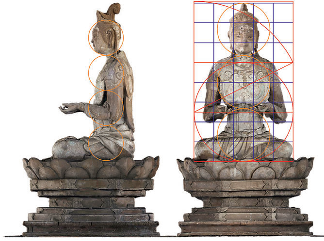 将3∶2这一比例运用在佛像与建筑设计中,使二者成为了“天地和谐”理念的具象表达。值得一提的是,《营造法式》里提到的材广(木材宽度)是15分°,材厚(木材厚度)是10分°,二者比值亦为3∶2。这一巧合并非偶然,彰显了中国古代营造技艺的传承延续。