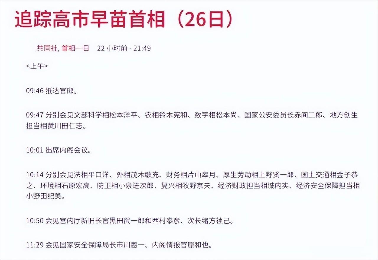 那天早上9点46分,她到达官邸。紧接着就开始一系列会见,先是和文部科学相、农林水产相等大臣个别谈话。