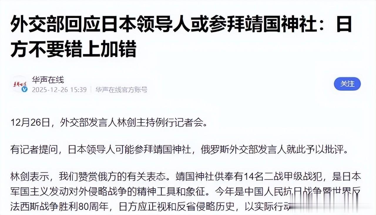 她后来澄清是基于具体假设情景,但立场没有后退。这样的发言,加上靖国神社的敏感性,让她在12月26日不得不小心行事。