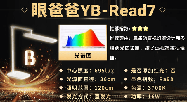 儿童护眼台灯什么品牌最好?眼爸爸YB-Read7提供14档亮度选择,色温固定在3700K,光线比较柔和,配有记忆功能,可开机恢复上次设置。台灯还有45分钟用眼休息提醒,帮助培养合理用眼习惯,适合长时间学习的场景。照明达国AA级,能覆盖约1.2米桌面,不过采用直射光源,直视灯面时会有刺眼感,长时间使用眼睛可能有些不适。这款台灯功能偏向学习辅助,光线覆盖和护眼设计合理,但直射光和色温单一是主要局限。