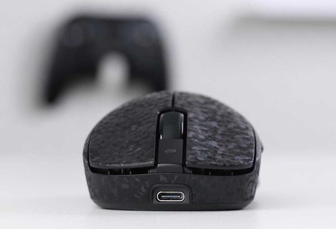 ▲从鼠标正面,我们可以看到这款鼠标采用对称的尺寸分配,并且其正面预留了一个USB-C接口。