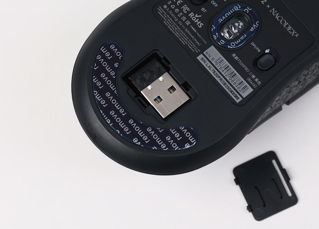 ▲鼠标底部下方,黑爵T520 PRO多模游戏鼠标贴心地设计了一个nano USB收发器的收纳槽。