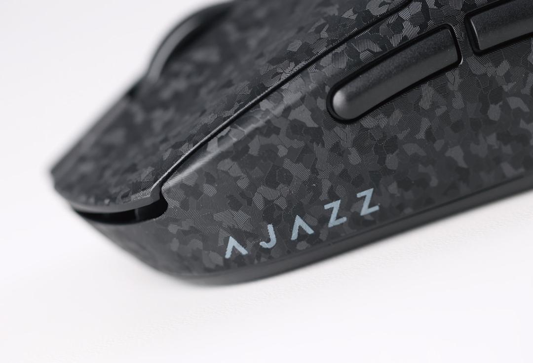 细节方面,黑爵T520 PRO多模游戏鼠标采用左右分体式按键设计,并且按键表面留有手指凹槽,利于握持。同时,为了确保鼠标足够轻量化,它的左右并没有适配防滑侧裙,并且左侧预留了两颗长条形侧键。同时,左前方印刻了黑爵的英文Logo用以画龙点睛。事实上,得益于碳纤维外壳以及表面复杂纹理的设计,黑爵T520 PRO多模游戏鼠标的表面能够提供充裕的摩擦力,因而我在握持它时,即便是快速提拉、晃动,也不会出现鼠标脱手的情况。