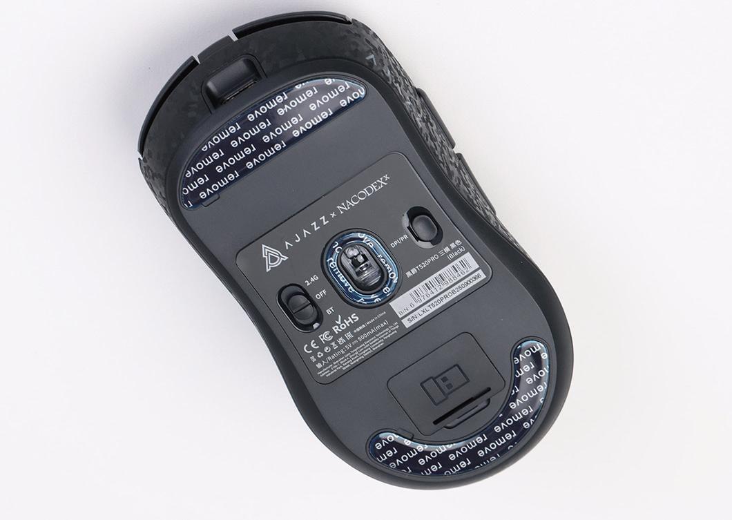 将视线移动到黑爵T520 PRO多模游戏鼠标的底部,我们可以看到除了3颗面积适中的脚贴之外,这款鼠标几乎将所有的功能键都集中到了底部正中,包括左侧的模式切换开关以及右侧的CPI切换/蓝牙适配开关。同时,黑爵T520 PRO多模游戏鼠标的底部下方也还贴心地预留了一个nano USB收发器的收纳槽,方便玩家更好地随身携带它。