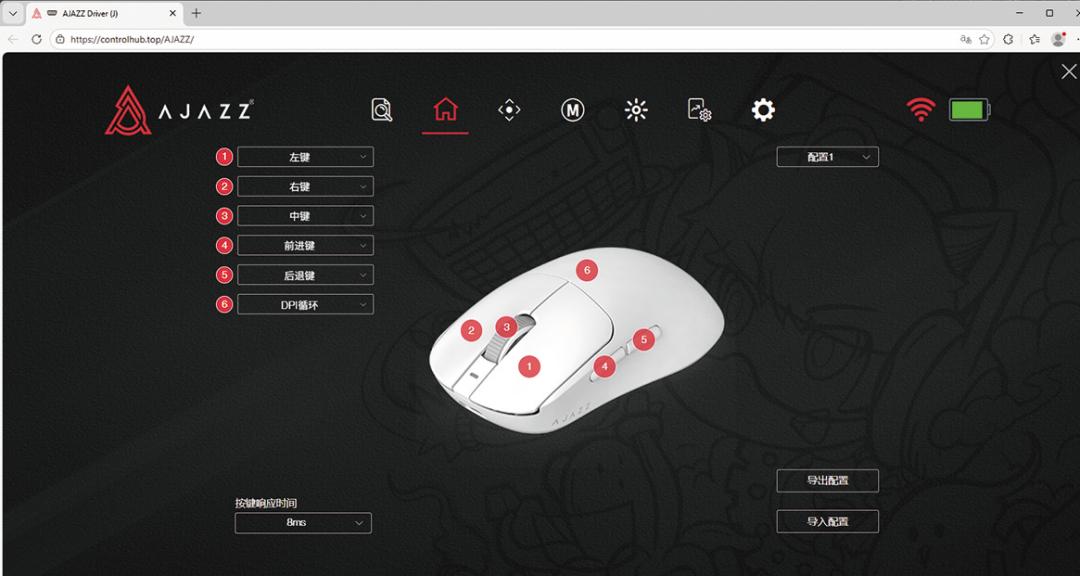 驱动方面,黑爵T520 PRO多模游戏鼠标除了可以通过定制驱动进行自定义调校之外,还能够使用网页驱动进行功能方面的调整—玩家只需要在黑爵官网上的“网页驱动”栏目中选中对应的产品之后,便可以进行自定义调整了。可以看到,黑爵T520 PRO多模游戏鼠标的网页驱动首页详细地呈现了该产品的实时状态,并且玩家能够对其按键功能、CPI以及回报率等基础参数进行自定义,并且能够保留6个CPI配置。同时,该驱动能够选定波纹控制、直线修正等功能,也能够允许玩家进行宏功能自定义。最主要的是,该驱动还支持鼠标休眠时间的调节以及“远距离”模式的启用,从而帮助玩家更好地使用这款游戏鼠标。