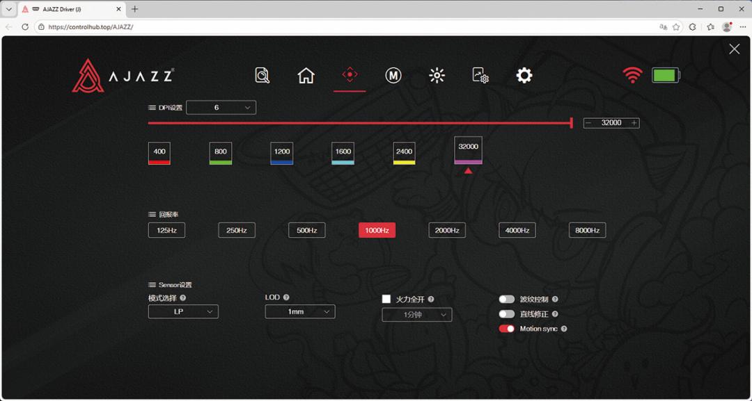 ▲该鼠标不仅支持最高32000 CPI以及8000Hz回报率的调节,同时也支持波纹控制、直线修正,并能够对鼠标适应高度进行设置。
