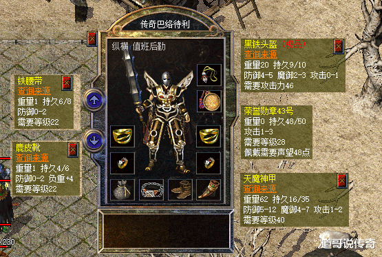 第四,服饰系列看完武器和首饰系列之后,咱们再品一品这位战士的服饰搭配:铁腰带和鹿皮靴是次顶级系列,不过金手镯的防御可以来弥补一下;攻3荣誉勋章和天魔神甲都是贵重的顶级系列;攻1黑铁头盔还是很稀罕的,好看又强悍,不过换成攻3道士头盔效果更佳。总的来看,这位运十套战士的实力在现阶段的952服必须是顶级之一,试问有几人能预支抗衡的?