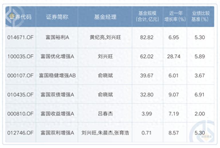 ② 富国优化增强债券A/B成立于2009/06/10,业绩比较基准为中债综合指数收益率*90%+沪深300指数收益率*10%。近5个完整年度(2020-2024)的基金份额净值增长率(及同期业绩比较基准收益率)为6.7%(5.43%),3.78%(4.17%),-7.85%(0.67%),1.97%(3.12%),9.48%(8.52%),数据来自基金定期报告,截至2024/12/31。期间基金经理变动情况:钟智伦(2009/06/10-2012/12/18)、陈曙亮(2012/12/18-2014/07/29)、张钫(2014/07/29-2017/01/23)、范磊(2016/08/19-2018/10/17)、俞晓斌(2018/08/31-2019/10/16)、张明凯(2019/03/19-2023/01/19)、刘兴旺(2022/12/23至今)。基金收益率不代表投资者实际收益率,基金份额净值仅为每份额基金产品的净资产。基金历史业绩不构成对未来业绩的保证。