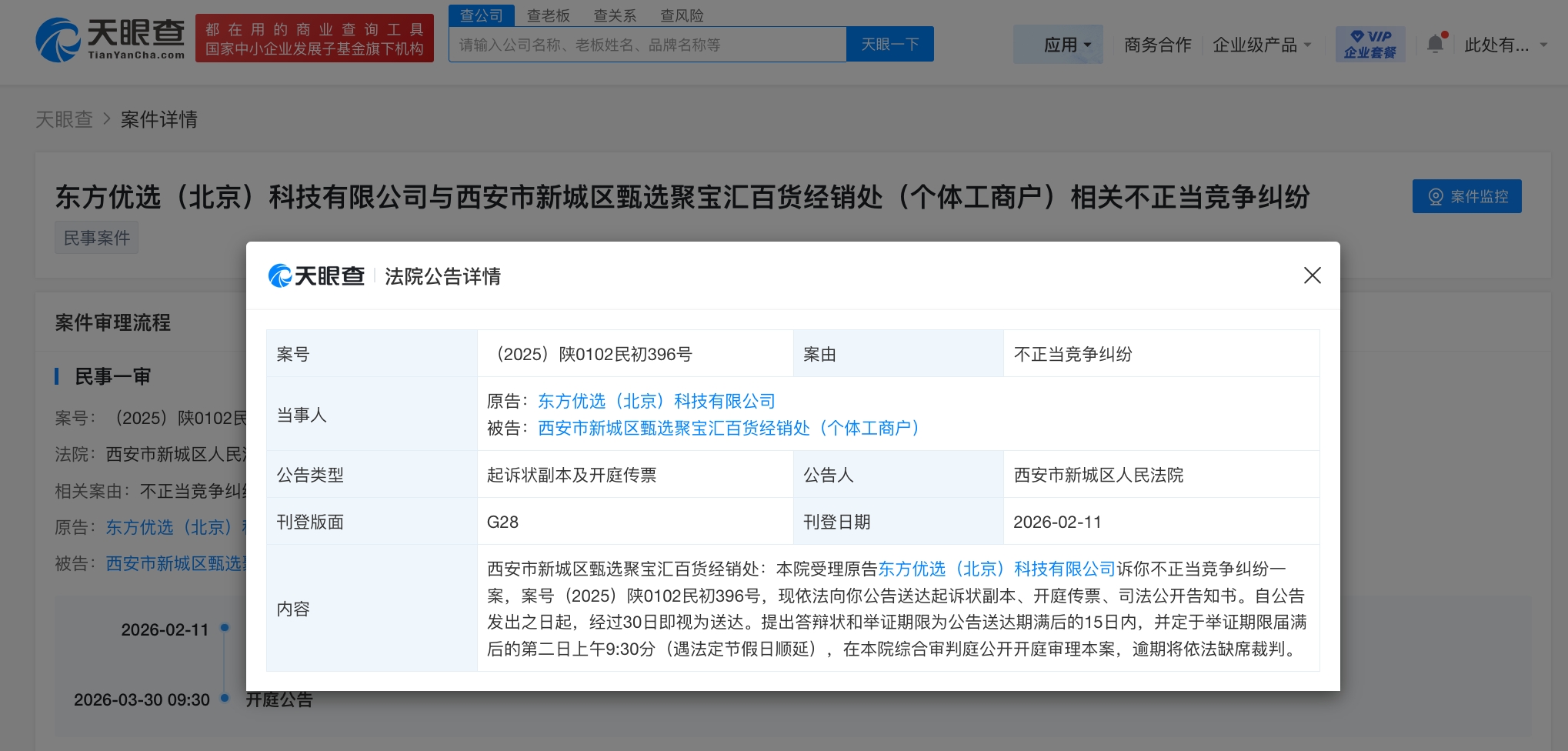 天眼查法律诉讼信息显示,近日,西安市新城区人民法院向西安市新城区甄选聚宝汇百货经销处(个体工商户)公告送达东方优选(北京)科技有限公司与其不正当竞争纠纷一案起诉状副本、开庭传票等,自公告发出之日起,经过30日即视为送达。并定于举证期限届满后的第二日公开开庭审理。