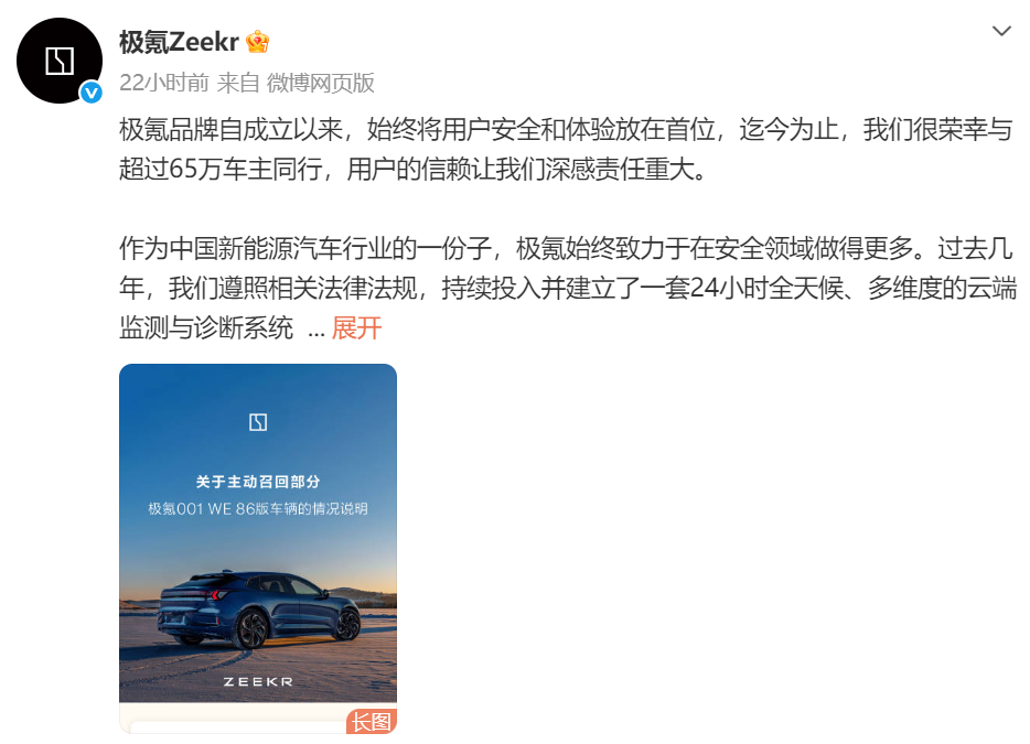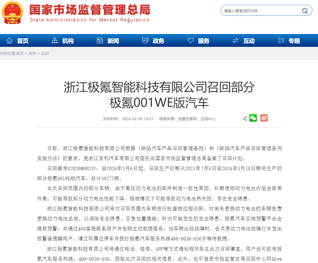 2月9日,国家市场监督管理总局网站显示,极氪汽车向国家市场监督管理总局备案,主动召回2021年7月至2024年3月生产的部分老款极氪001 WE 86版车辆,通过检查或远程诊断,为相关车辆免费更换动力电池,召回涉及车辆共计约3.82万辆。2月9日当晚,极氪汽车在其官方公众号也发布了相关说明。