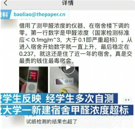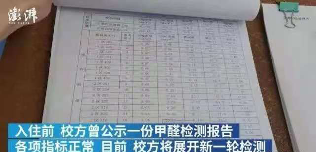 但对于学校去年进行的空气质量检测,学生们也表达了自己的异议。“去年入住的时候我们就自己进行了检测,结果超标于国家标准。”某位同学表示。