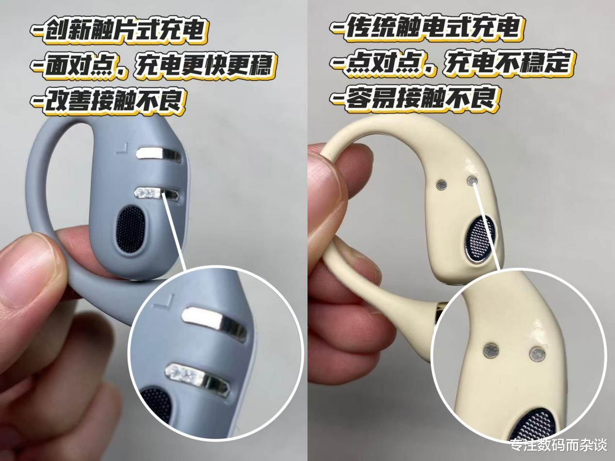 优点:开放式的设计戴起来很舒服,不用塞进耳朵,对耳道基本没压迫,长时间听歌耳朵也不会觉得累;而且这种不堵耳道的结构通风又清爽,不容易积汗滋生细菌,对耳朵健康更友好;更重要的是,它不会隔绝环境声,听音乐的同时还能清楚听到周围动静,不管是出门逛街、跑步还是通勤,都能更安全地使用。