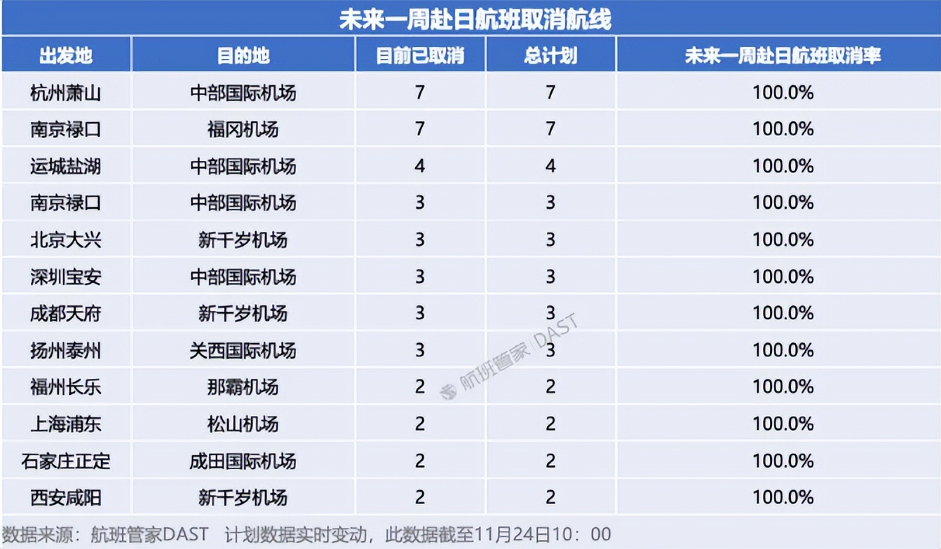 援引航班管家DAST的监测数据:未来一周中国赴日计划航班取消率将在27日达到21%,为最近1个月以来最高值。从计划航班来看,由于计划航班量较低,截至24日10点时已有12条航线取消所有航班。