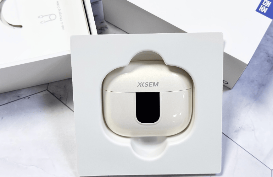 这款耳机的充电盒采用了“太空舱”设计,造型方正又带点圆润感,表面有磨砂处理,手感不错,整体像一个小巧的珠宝盒。单只耳机重量约4克,搭配天鹅颈设计,外观流畅,戴起来轻松,长时间使用也不会觉得累,不过佩戴的稳固性还有提升的空间。